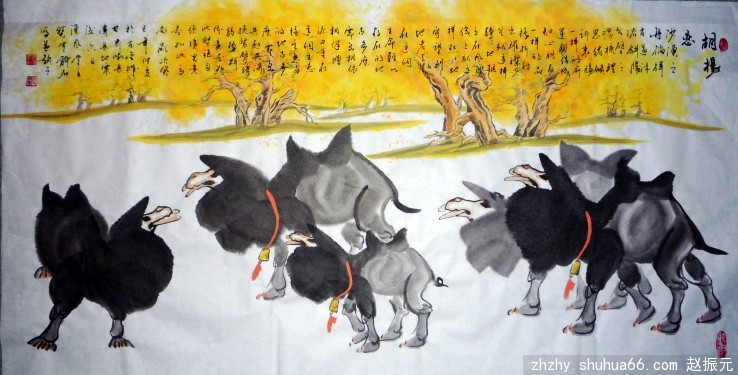 沙漠之舟徜徉古道 沐浴斜阳 戈壁之魂梳理思绪 倾诉衷肠 一样的命运联结成知心朋友 一样的品格折射出璀璨光芒 就这样 静静地挺立在风沙线上 就这样 默默地守望到地老天荒 在这个生命难以存在的地方 多么需要相依相伴增添力量 在这个生态极其恶劣的地方 多么需要共勉共济挽紧臂膀 弱势群体竟是如此坚强 自强境界竟是如此高尚