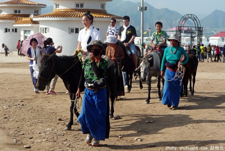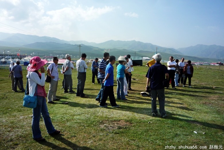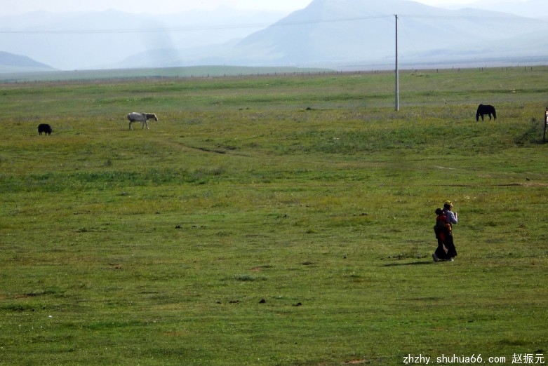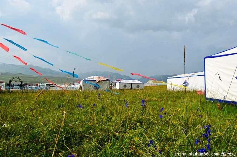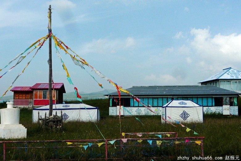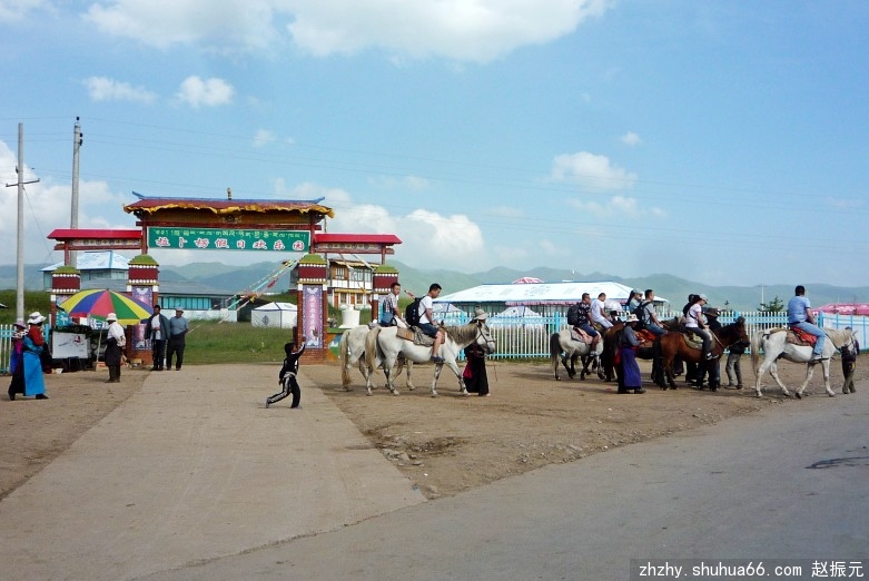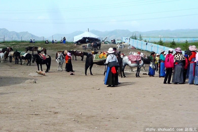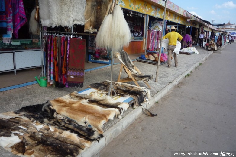 马路边,牧民们盖起了一排商铺,摆放着各种民族工艺品,供游客选购。我们一行信步漫游草原,尽情领略藏族牧民的民俗风情。