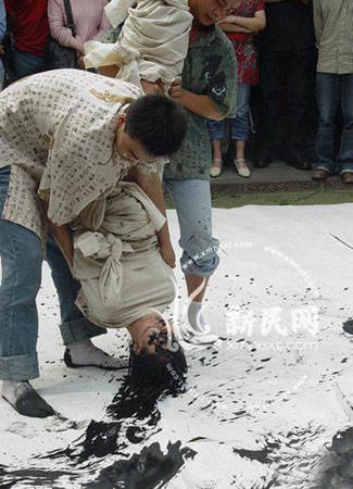 记得大约在上世纪末,有过一部《唐伯虎点秋香》的电影,其中有才子唐伯虎把人体作笔,饱蘸浓墨写字的画面。那是用虚拟的夸张手法和电影蒙太奇特技手段制作而成的喜剧场面。就是这个场面,如今也被人变成了现实!据《新民网》报道:在2006年10月25日 ,某大学演出了“惊世骇俗”的书法“创新”大戏:一个活生生的少女被两个“书法家”当成毛笔,蘸墨涂鸦。只见一年轻女子全身被白布包裹,两个年轻小伙身着牛仔裤和写满楷书的短袖上衣,一个抱女子上身,一个抱女子双腿,将她“倒转乾坤”,长发蘸上面盆里盛着的墨汁,以头点地,涂抹于铺在地上的白色宣纸上。
