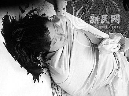 真是独创、首创,敢为天下先!只是可怜了这个小女子,脸上溅满了墨汁,头碰擦在地上,把纸张都擦破了,表情痛苦,狼狈不堪;两个“书法家”也不轻松,看上去体力不支,磕磕绊绊;创作出来的“书法”自然更是一塌糊涂,“写”出的字何种模样,未见照片,估计其水平不会高到哪儿去!