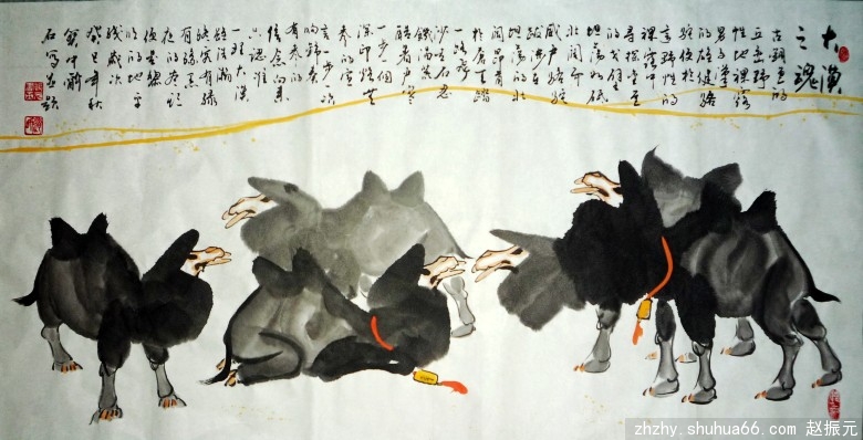 古铜色的丘峦,野性地裸露男子汉的雄健,骆驼便于这野性的裸露中寻探 。金色的戈壁,坦荡如砥,壮阔而威严,骆驼跋涉在坦荡的壮阔。昂首于苍天,踏一路飞沙走石,忍饥渴荒凉酷暑严寒,一步一个深印。烙无声的宣言,一步一次响铃,奏有声的信念,向来只认准一理。大漠虽浩翰,终究与绿有缘, 黑夜的尽头,便是黎明的地平线。