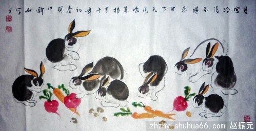 这幅作品也是朋友定作的作品,他们全家都属兔子,要求画一幅大点的兔子,春节过后,我创作了这幅“月宫冷清不堪恋,甘下凡间噛菜根”。请欣赏。