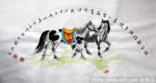 2、骏马欢腾踏草露,远山霞蔚雾云迷。