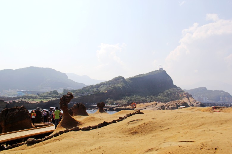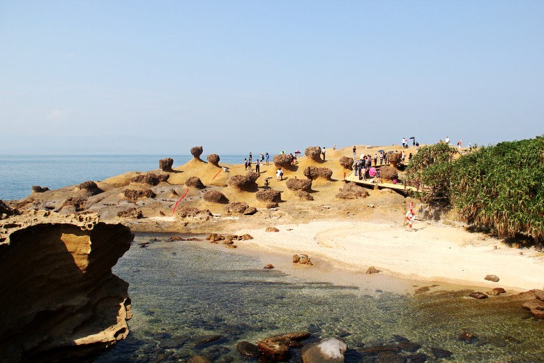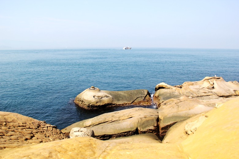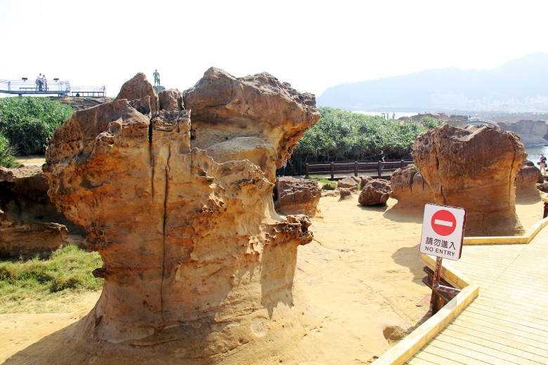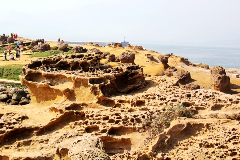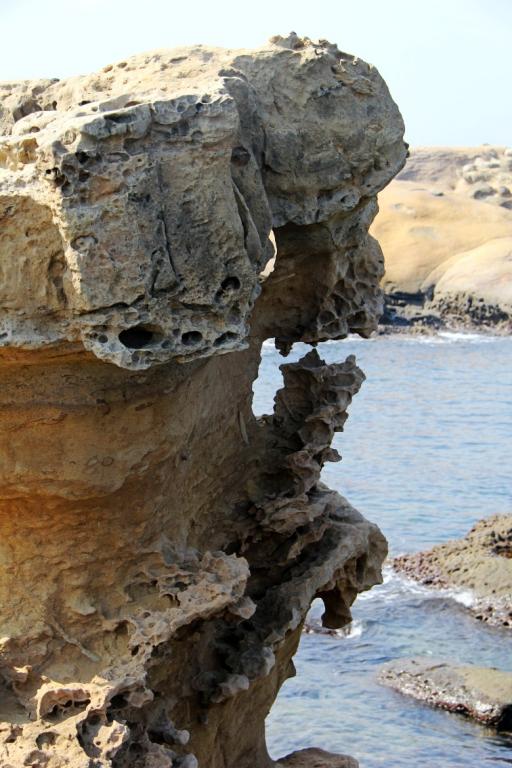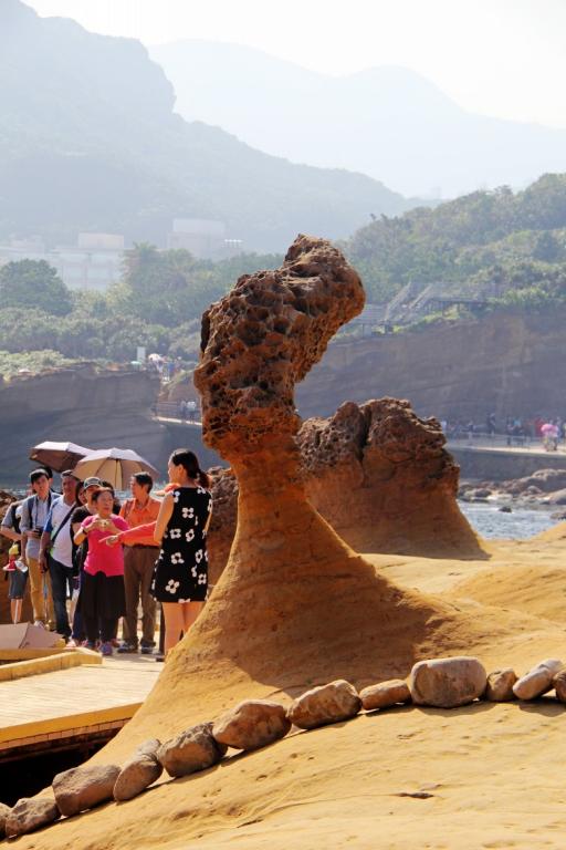 野柳地质公园位于台湾基隆市西北方,是凸出海面的狭长岩石群,从远处望去,好像一只大海龟向太平洋缓缓爬去。受地壳运动和海浪的侵蚀,经过千万年大自然鬼斧神工的雕琢,这里的岩石展现出千姿百态的天然惊世地理景观。根据这些岩石的形状,人们把它们叫做蜂窝岩、豆腐岩、蕈状岩和姜岩等。由此野柳成为台湾最负盛名的地质公园。