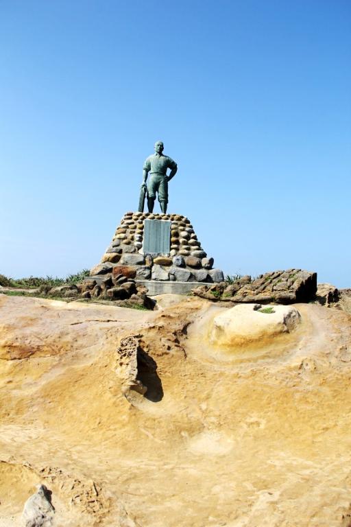 那是一座座惟妙惟肖的烛台,光滑圆润的底座,高点凸出的蜡烛芯,好象烛火刚刚被海浪打灭;那片岩石上撤满了大小不一,深浅不同,首尾相连的洞穴,小的象蛀洞,大的象蜂窝;谁的脚印,斑斑点点,随意漫步,那是海蚀壶穴的印痕;突然,一个熟悉的身影引来游人的惊呼和感叹,她发髻高耸,微扬坚挺的脖颈,抬首远眺,那凝思遐想的样子极其高贵典雅,那就是女王头。