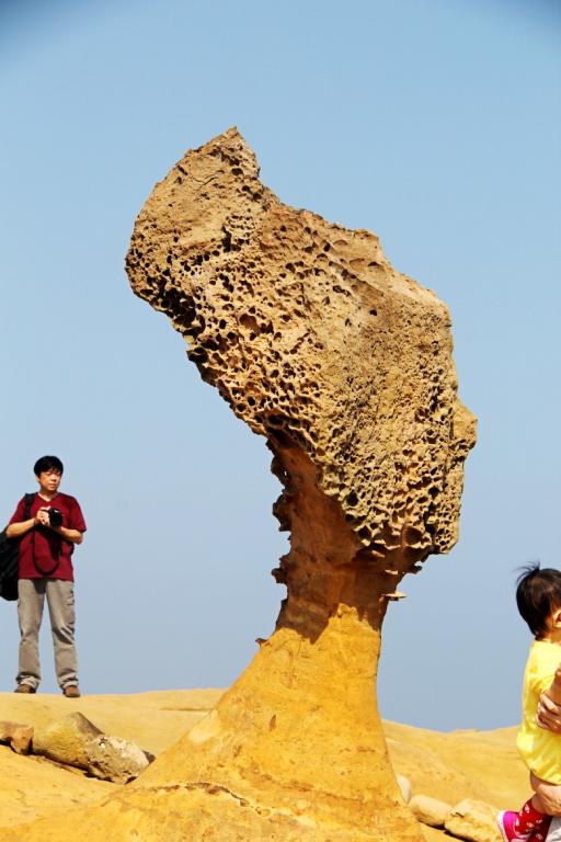 如今,独领风骚数百年,饱经风霜,已经日见消瘦的女王头,在历史的长河中,已经度过了蕈状岩的诞生期、无颈期、粗颈期和细颈期,不知何时,当它的颈部无法再支撑头部的重量时,她就会终结生命,从人们的视线中消失。难怪警示牌上告戒游人,远离女王头,伸手罚巨款。