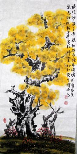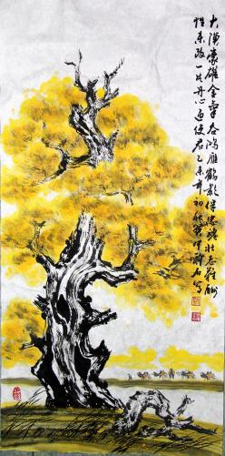南天渺渺,西极茫茫,烈日铄金,瀚海苍黄。芸芸众生,洵是天骄瑞华;烨烨胡杨,直令血脉贲张。簇筋拗骨,方其相逢骇瞩;突枝凌兢,迥殊嫩绿俗芳。红叶与落霞相映;雁唳携驼铃远翔。醉心夺魄,一望朔漠横雕;震憾无极,几多铁骨昂藏。敬其肃穆古高,泱莽中信然嶷立;鳞皴朴拙,尘嚣外器宇轩昂。 秉浩气而生者,不傍山水之贵,迎骄阳而立者,愈历催折愈强。对峙风沙,莫许狂魔恣虐;结叠屏障,漫将根柢深张。生生不息,羡尔萧然老健;勃勃野性;敬尔点染鸿荒。羁云而顶天,面辽阔豪情愈远;栖心而修内,处寂廖品性弥彰。仰天山之浑厚,是以金华彩焕;得冰河之滋润,不为风仆雪僵。与天合契,昭然磊落;与世殊伦,奋勉非狂。格清貌古,储亿万年之记忆;色严气毅 ,历百千劫之沧桑。远送丝路商旅,平遮古城残墙。拂散龟兹乐舞,催睡楼兰丽娘。鉴西域古国之繁华;扫铁马金戈之悲怆。吐英雄沥酒之豪气,显侠士亮剑之阳刚。直让宿敌尊敬,懦夫慨慷;金雕振远,颓思消亡。志士守节兮,雄立于狼行之野;忠臣赴义兮,威加于罴立之荒。尊严无价,岂眈流云蜃景;气节永恒,撑持心域天堂。金风曳彩,将血色泼染天穹;绝域栖精,任躯干历洗风霜。斤斧即收,原夫巨灵惊竦;雷霆纵起,权当天鼓铿锵。石齿已碎,胡杨益茂;沙流未敛,胡杨岂殇。寂有冥修之螭龙;动有护道之金刚。性合不死之漠神,质膺大荒之木王。烈马腾嘶,西域之豪情激壮;狼烟不再,民族之内力雄强。粹万笔之灵华,怎形其精神;撷千书之警句,难煜其诗章。草仙木神,莫来收艳摄奇;岳侠海客,只合膜拜焚香。天山客心灵为撼,开襟而吟,诗曰:千年不死大漠魂,千古还留不倒身。千载犹存傲世骨,千秋不朽是龙根。