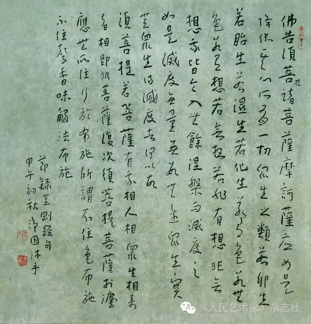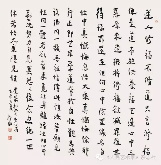 陈传席: 净圆居士书法出入弘一一路,又广师百家,自成一格,圆浑高古,秀骨沉静。余观今人书多矣,惟净圆书足观,余子不足道也。 叶培贵: 他对艺术、对人生有他独到的一种追求。他愿意舍弃很多世俗、繁华的东西,愿意为艺术、为美的追求来奉献自己所有的智慧,这一点我特别地佩服。从笔墨上我们可以看到,他舍弃了以前很多相对浮于表面的比较花哨的技术追求,敢于放弃那些东西,然后往深了去追求精神层面的东西。我认为这个是他有意地舍弃形,舍弃技,而向神,向道这个层面去追求。这恰恰意味着他的艺术在走向深度,走向更高的境界。