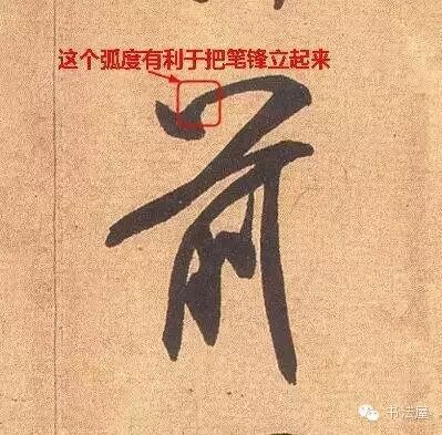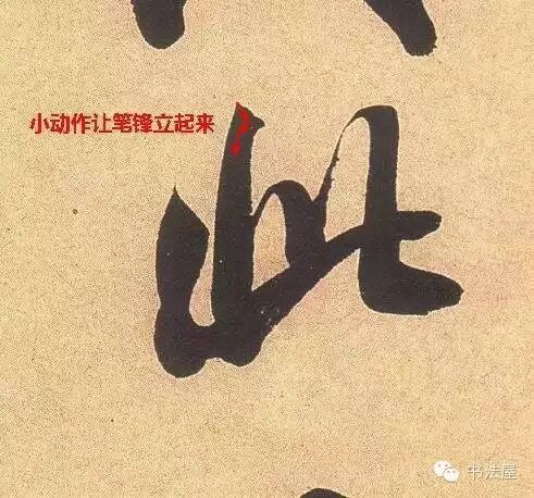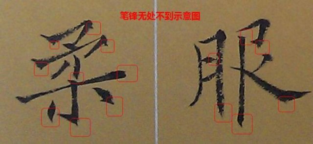 笔毫的末梢:锋,是笔力集中到达,墨水集中流注的地方。善用笔者,能使笔站起来以锋芒运使,这叫"立峰",笔锋挺而健,有效得传达指腕的力量。在曲张之间"杀"入纸中,获得力透纸背,入木三分的效果,如不能发挥锋的用场,单以笔腹扫顿按,笔画必质感薄弱,墨象虚浮。