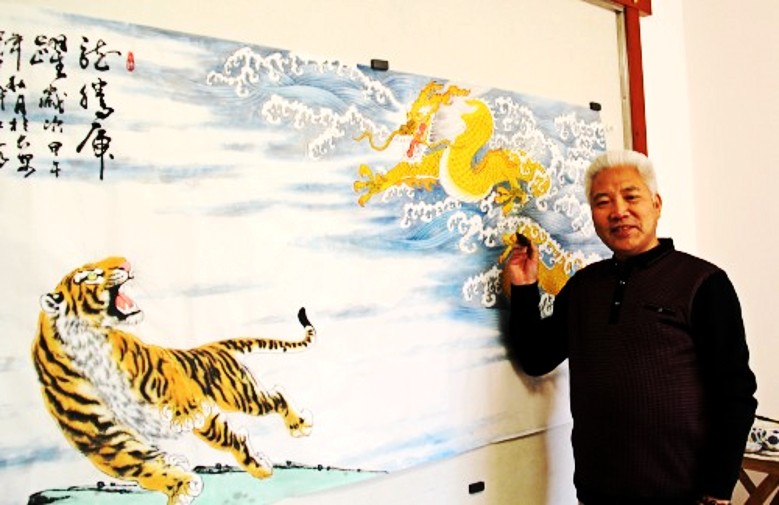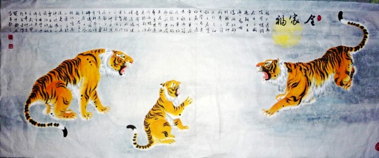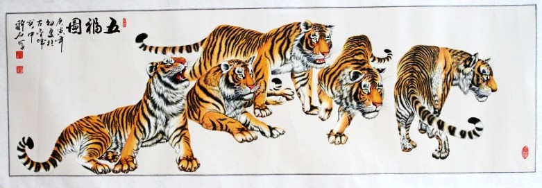 2000年至2001年,他用了八个月时间,精心创作了长30米的巨幅“百虎图”, 一百只老虎或群嬉、或独行、或蹲、或跃、或卧、或啸,有的虎虎生威,有的活泼可爱,神态各异,栩栩如生。以其磅礴的气势而倍受广大观众青睐。纵观他笔下的“百虎图”、“奔腾急”、“合家欢乐”、“威震五岳”、“五福图”、“龙腾虎跃”等形象准确,神韵贯通,运笔简练,线条优美,骨骼清晰,将虎的喜怒哀乐表现得淋漓尽致。2007年10月,原兰州军区政治委员、军事科学院政治委员温宗仁上将看了他的老虎作品后,赞誉他:“军旅骆驼王,老虎亦称王”。鼓励他创作出更多的优秀作品。