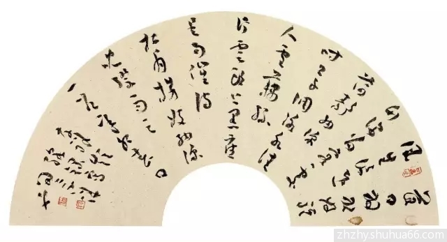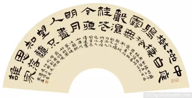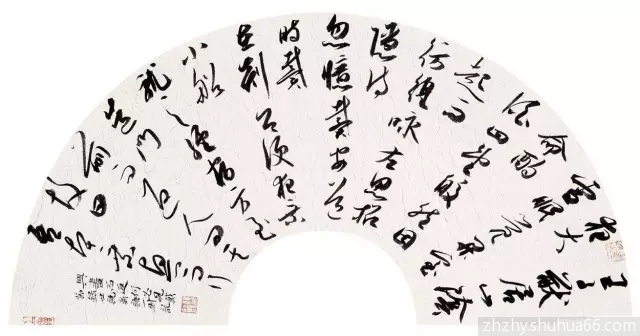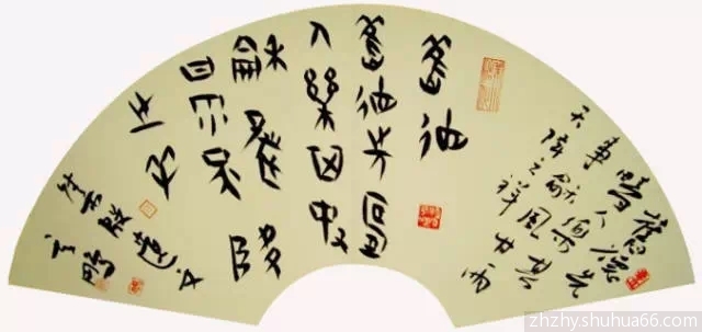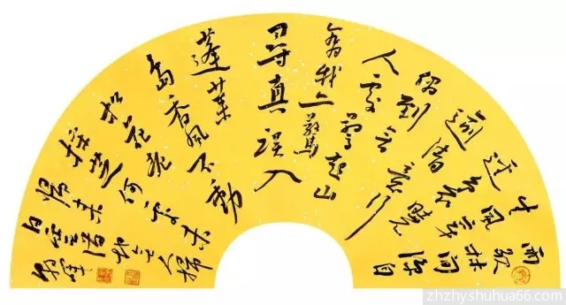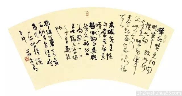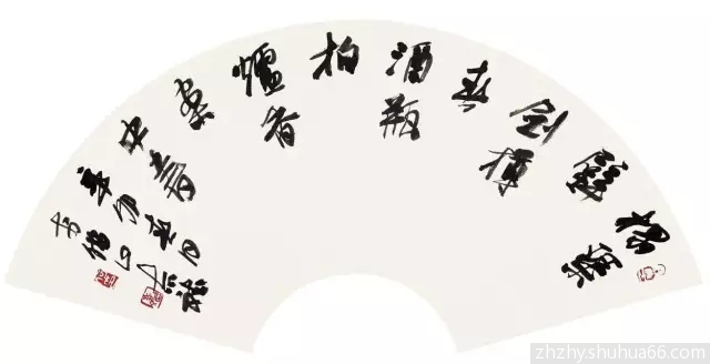 上端依次书写,下端隔行书写,形成长短错落的格局。这样则可避免上端疏朗,而下端拥挤的情形,达到通篇的和谐。这种格式,先写长行,以五字左右为宜,短行以一、二字,也可“三二”或“四一”的跳跃式布局,使扇面灵动。落款要精彩,一般写在正文后面,一行或数行均可。即章宜小于落款的字。
