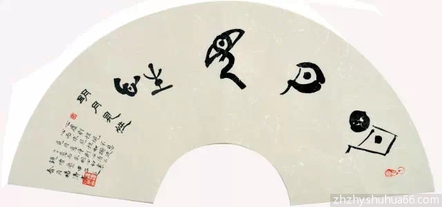 写少数字,利用扇面的宽度由右向左,横排书写二至四字,要收放有度,落款可写数行小字,与正文相映成趣。