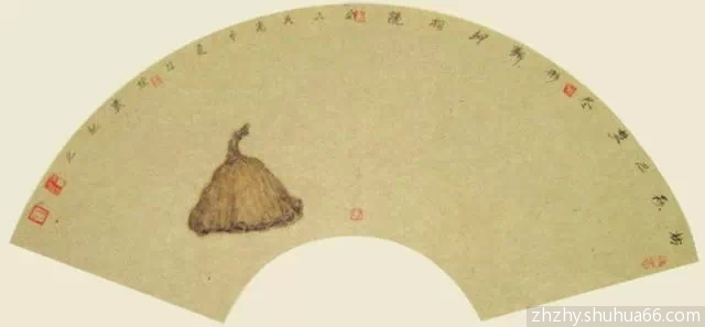由于扇面上宽下窄的形状,使得折纹与拆纹之间也是上宽下窄。这种独特的样式,就要求我们在创作时,做出恰当地安排。那么,扇面的章法要怎么玩?