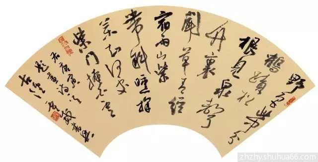 扇面书法的创作应当注重书体与形式的和谐统一,如篆、隶书多厚重古朴,大草多昂扬畅达,此三种书体字径稍大更能表现字体自身特性和书写者的创作水平。小楷、小草和小字行书,如果要写成较大的扇面,章法上要随形就势、灵活多变。