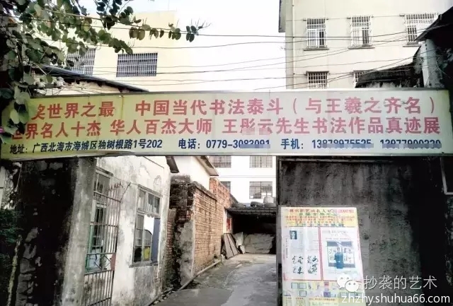 在一个有些破落的宅院门口,挂着一条大横幅:“获奖世界之最、中国当代书法泰斗(与王羲之齐名)、世界名人十杰、华人百杰大师王彤云先生书法作品真迹展”,下面还写有地址、电话、手机号等信息,似乎向人们表明自己坐不改姓、行不更名、与世比肩的真实可靠性。