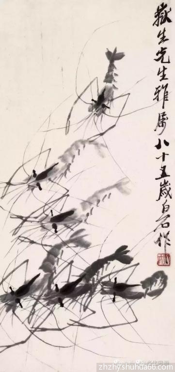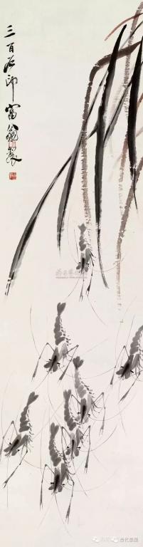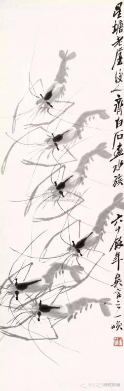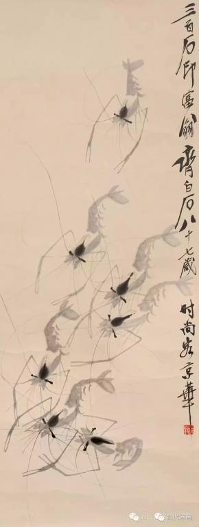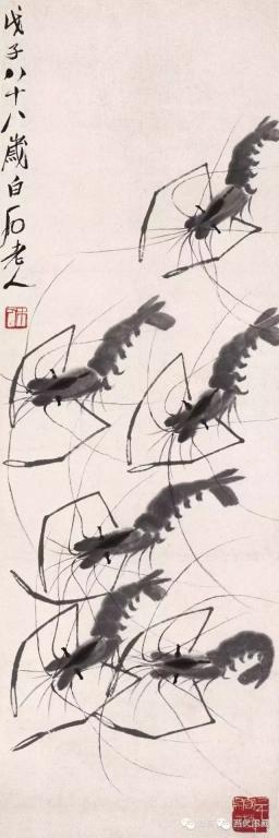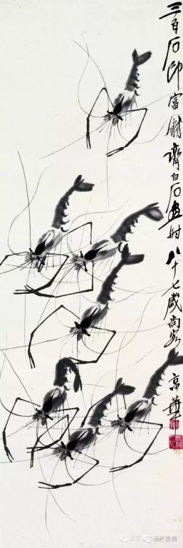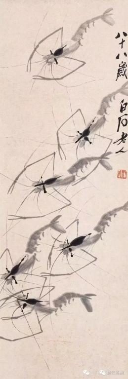 七十岁以后白石老人画虾已基本定型,但仍在不停的改进,使其趋于完美,八十岁以后他的虾画的已是炉火纯青。活灵活现的虾配上芦苇,水草,慈姑,奇石,翠鸟等等,更以刚劲古拙的书法题上自作的诗句,加上充满力感的印章,成就了千百幅给我们高雅艺术享受的珍贵作品,极大的激发了我们对于生活的热爱。 画虾仅仅是白石老人的雕虫小技,在他的艺术宝库中千百幅艺术珍品静待我们去观赏学习。