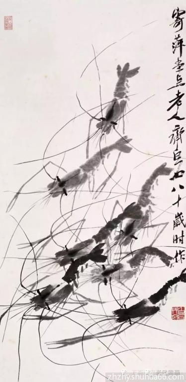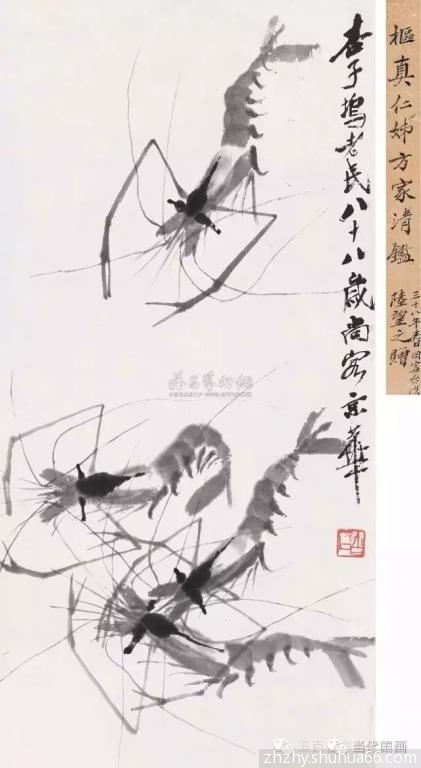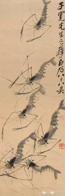 白石画虾开始学八大,板桥等人,因时代关系那些古人画虾并不成熟,所以白石的虾只是略似的阶段。