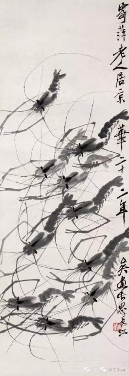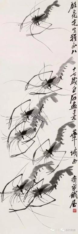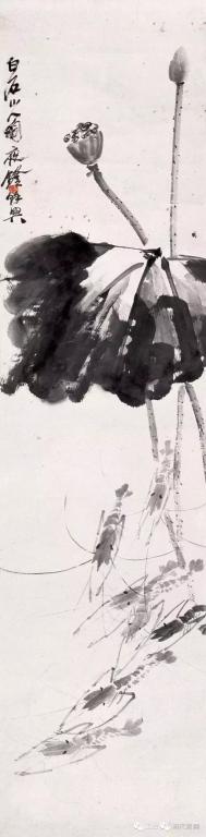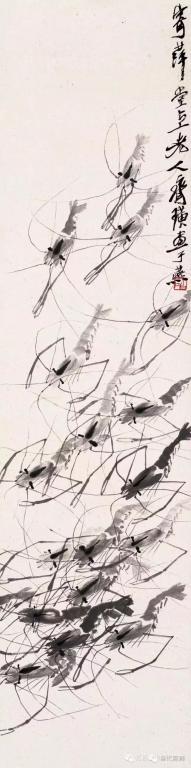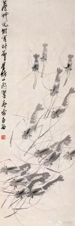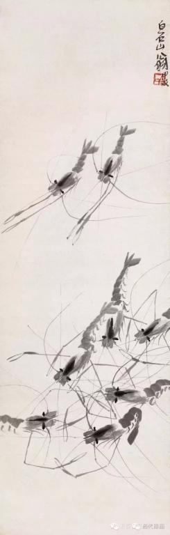 深谙艺术规律的白石老人将躯体透明的白虾和长臂青虾结合起来,创造了“白石虾”,其实这种水墨虾在自然界并不存在,但是在符合虾的共性的前提下白石鬼斧神工地将他的“妙在似与不似之间” 的理念演绎的巧妙致极。
