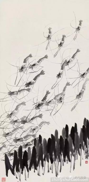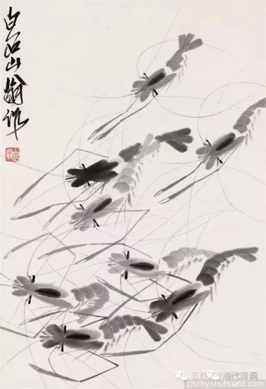 再以后,他在观察虾的过程中,将虾的进退,游的急缓,甚至斗殴,跳跃等等情态统统收于笔端。更于笔墨变化上增加变化,使虾体有了透明感。他在画虾的头胸部时先用小勺舀清水滴在蘸了淡墨的笔腹上,使 之有了硬壳般的感觉。通过观察,强调腹部第三节的拱起, 很好地表现了虾体的曲直 ,弹 跳 的姿势, 因虾的跳跃全靠腹部,这样虾就画得更生动了。他又将虾钳的前端一节画粗,笔力得以体现。最令人叫绝的是他在虾的头胸部的淡墨未干之际加上一笔浓墨,立刻增加了透明感,也使中国画的笔墨味道更浓了。虾的眼睛也由原来的小黑点儿变成横点儿,这是为了更好的表现虾的神情而加以夸张的。但是运用的恰如其分,大家见了并不以为怪