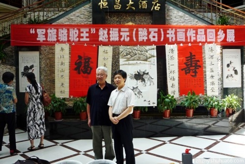 进入80年代,我的作品先后参加“世界当代书画名家作品展”、“国际现代书法展”、“中国当代名家赴台展”、“中国当代明星杯书画展”、“甘肃省纪念建国40周年书法展”、“甘肃省第一届新人书法作品展”、“大西北军旅艺术展”、“全军书法观摩展”、“全军第五届卫生美术展”等60余次大展赛,并分别获一、二、三等奖。我的作品早已飘洋过海出国和在港台、日本、法国等地展出,并被日本、新加坡、法国、加拿大、德国、瑞典、韩国等国际友人和国内外博物馆、图书馆收藏。多次受到部队嘉奖,并荣立三等功。近年来又先后被国内外有关书画组织授予“当代书画艺术名人”、“世界书画名人”“海峡两岸德艺双馨艺术家”、“军旅骆驼王”、“华夏第一驼王”和“第一驼王”等称号。08年在抗震救灾活动期间,我踊跃参加书画义卖捐助活动,被甘肃省慈善总会、中央电视台书画频道、甘肃国画院、甘肃丝绸之路协会等颁发了荣誉证书。分别被甘肃电视台、兰州电视台、厦门电视台、西安电视台、香港评报、解放军报、甘肃日报、中华热土画报等20余家新闻谋体宣传报道。1995年11月兰州电视台为我拍摄“翰墨铸军魂”专题片。传记和作品分别被载入《中国当代文化人才传略》、《国际现代书法篆刻大观》、《世界当代书画名家作品集》、《中国当代艺术界名人录》、《中国美术书法界名人名作博览》等20余部辞书。出版了《赵振元书画集》和《军旅骆驼王——赵振元书画精品集》。