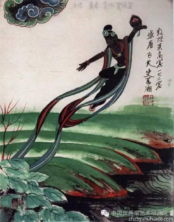 棕色飞天左手托莲花,肩披青绿色长飘带。绿色的大地上,有山崖和流水衬托飞天徐徐向上升起。