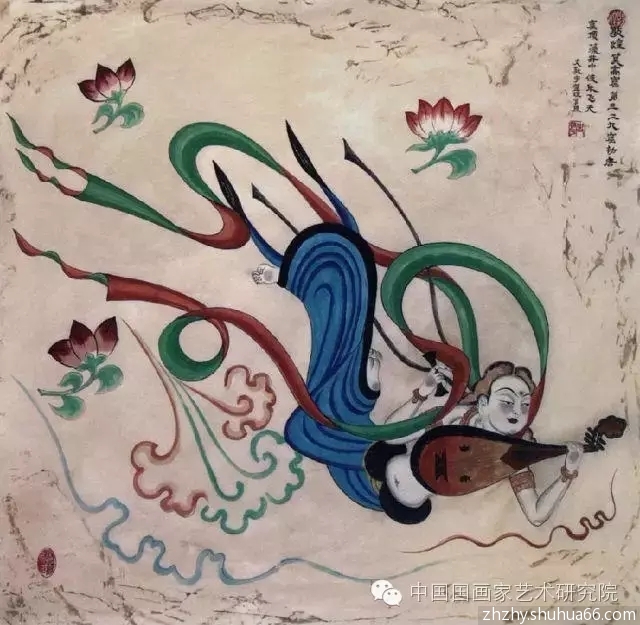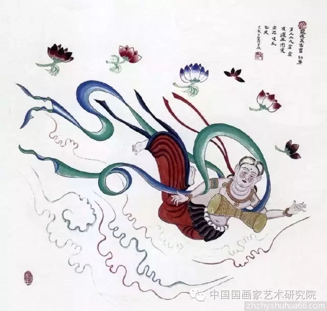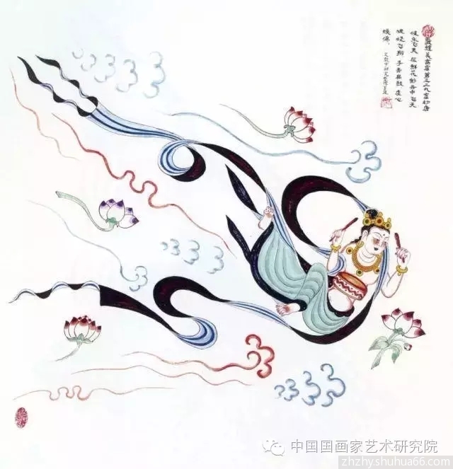 飞天吹奏芦笙,在莲花、彩云中遨游。