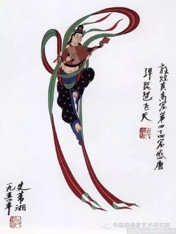 飞天怀抱琵琶右手拨弹,全身凌空向上飘举。