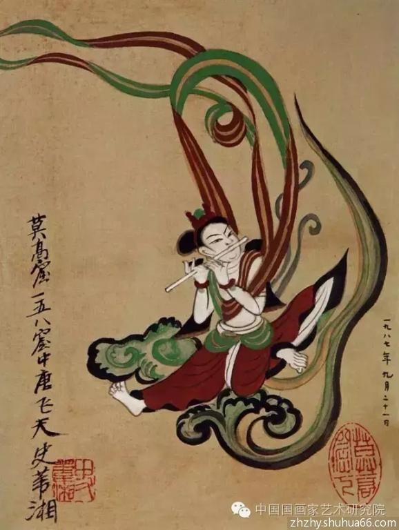 飞天吹奏横笛,双腿分开,乘彩云缓缓下降。