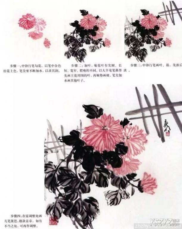 步骤一:中锋行笔勾花,以笔中余色给花上色,笔尖要不断加水,以求其润。