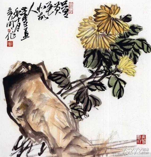 步骤二:干笔侧锋画草石,与菊花形成对比。山石用淡赭石侧锋扫出,注意适当留空。花也可不上色。