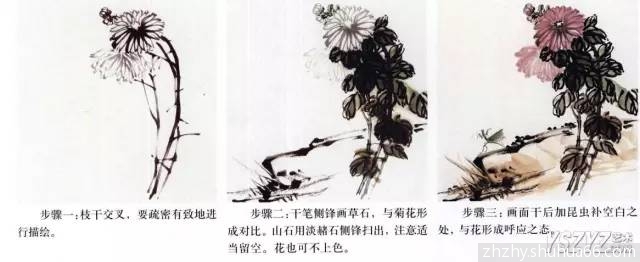 步骤一:先画石,再画花成开合之势。以枯润之笔连接花与石。