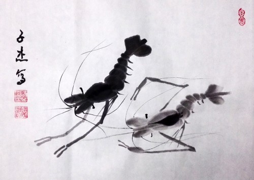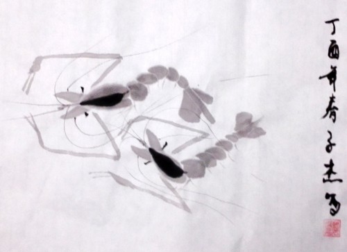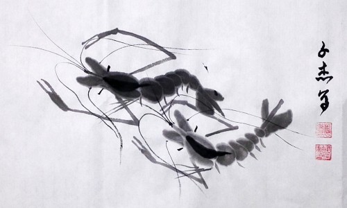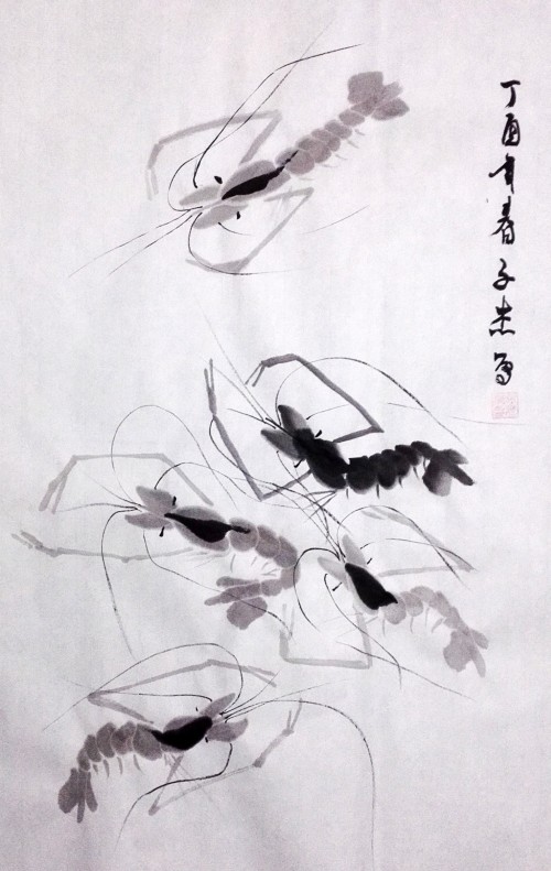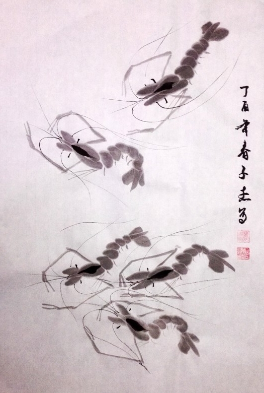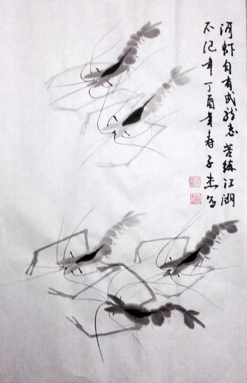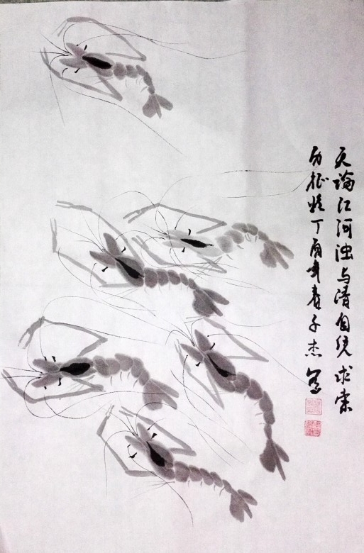 今年寒假期间,让爷爷教他学习画虾,他很有悟性,一会功夫就掌握了画虾的基本技术。为了让他学好画虾的技术,爷爷一开始就临摹齐白石的虾,这样起点就比较高。因为他爷爷也没有画过虾,为了教小孙子,爷俩只好边学边教,同步提高。这不,他画了好多幅虾,一发到微信,朋友见了,都要求收藏几幅。因此开学前忙得不亦乐乎,今发几幅,请朋友们点评。谢谢!