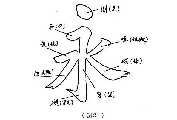 永字八法是古人以永字为例,概括地阐述楷书八种基本点画用笔要点的方法。关于它的来像,历来说法不一,大约是在楷书盛行的隋唐之际,书家为指导初学者习书,便取被誉为“天下法书第一”的王羲之《兰亭序》的第一个字“永”为例,总结出一套欲以简驭繁、“以开字中眼目”的教学方法。在永字八法中,点叫作侧、横叫作勒、竖叫作弩、竖勾叫作趣、挑叫作策、竖撇叫作掠、横撇叫作啄、捺叫作碟(见图21)。点画的命名虽然很奇特,但寻其字义,皆暗含比喻,说明该点画应如何写才能得其骨力、神韵。下面我们顺次试作简要的说明。