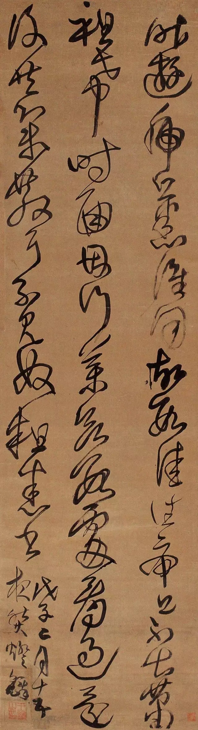 从轴类竖式的草书作品和卷类等横式的草书作品相比较而言,竖式作品的题款远没有横式作品题款的样式丰富。从题款字迹及空间安排上看,王铎对草书竖式作品的款字,虽极为认真,但形式效果相对简单,而草书横式作品的题款的空间安排却非常丰富。这当然与作品的创作形式相关。