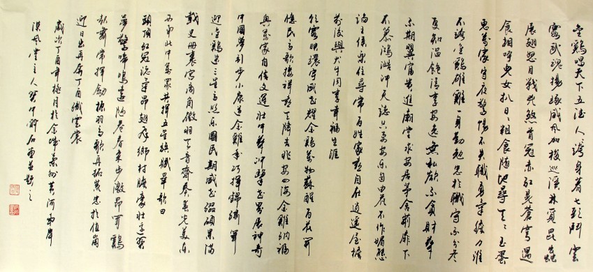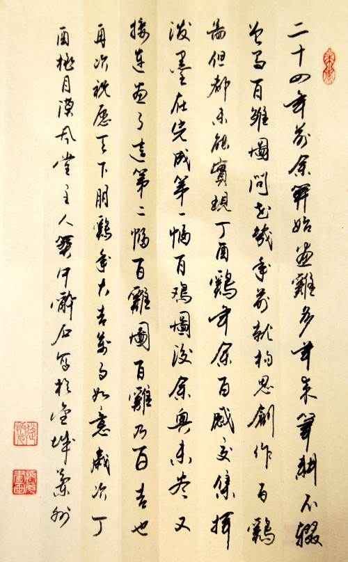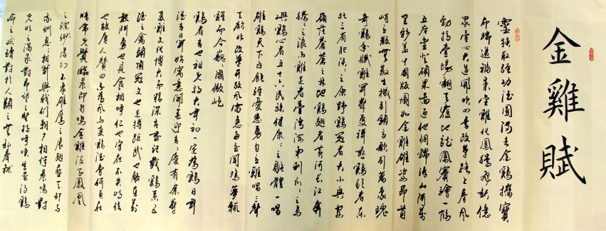 金鸡唱天下,五德人人夸。身著七彩斗云霞,武魂扬琢威风加。梭巡溪林觅昆虫,展翅怒目战兄煞。首冠赤红晃苍穹,遇食相呼儿女扒。日日粗食随地寻,天天玉蛋惠万家。守夜警惕不失职,勇气胆力谁不夸。金鸡雄鸡,一身勤勉,忠于职守,不分冬夏。知温饱、清享安逸;无私欲、不贪材华。不期翼富贵进庙堂,求安居茅舍荆扉下。不慕鸿澔冲天志,只要安乐自由花。不作媚态谄王侯,乐住寻常百姓家。喜自在逍遥屋檐前后,与犬牛同享幸福生涯。