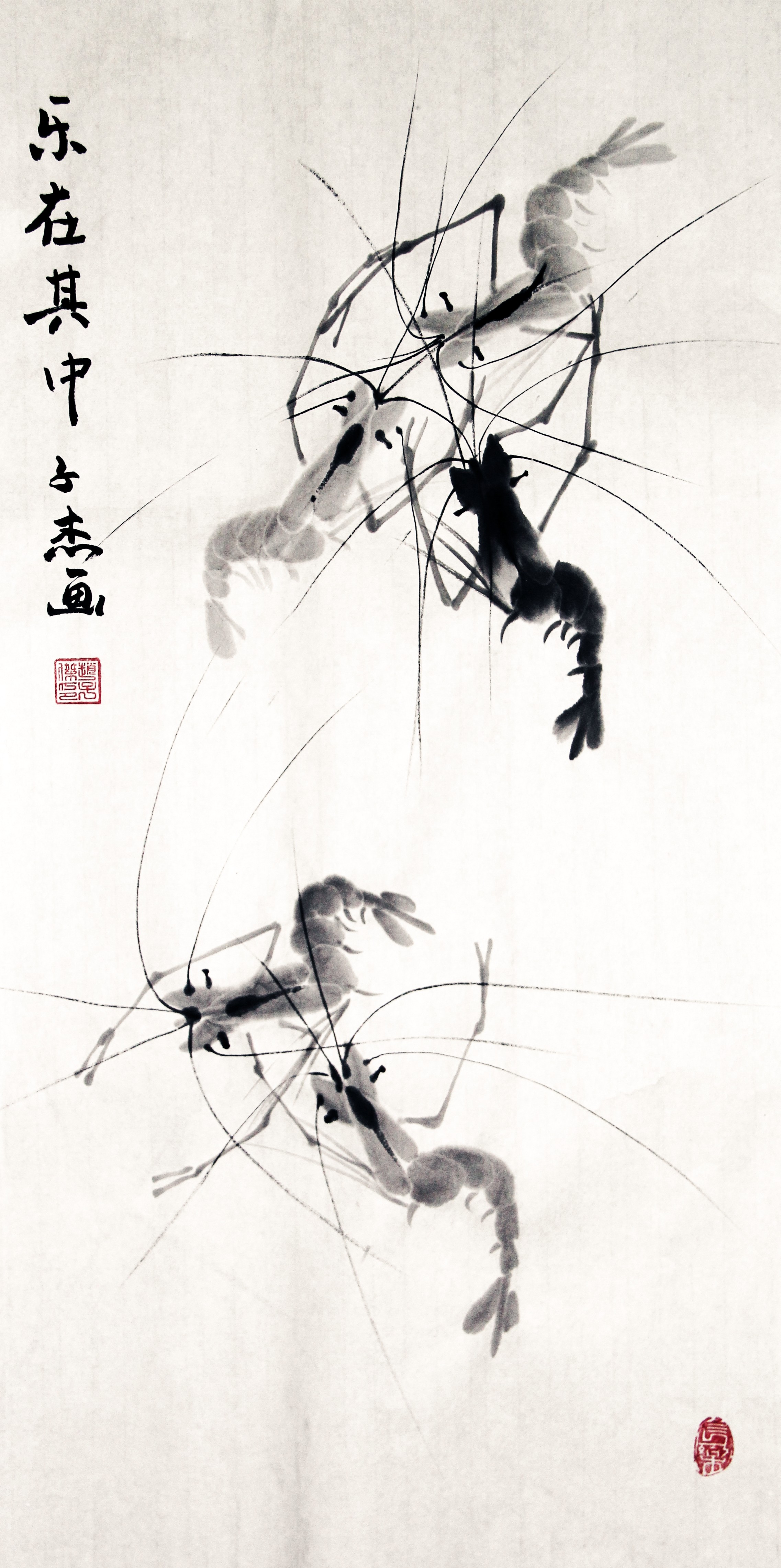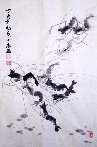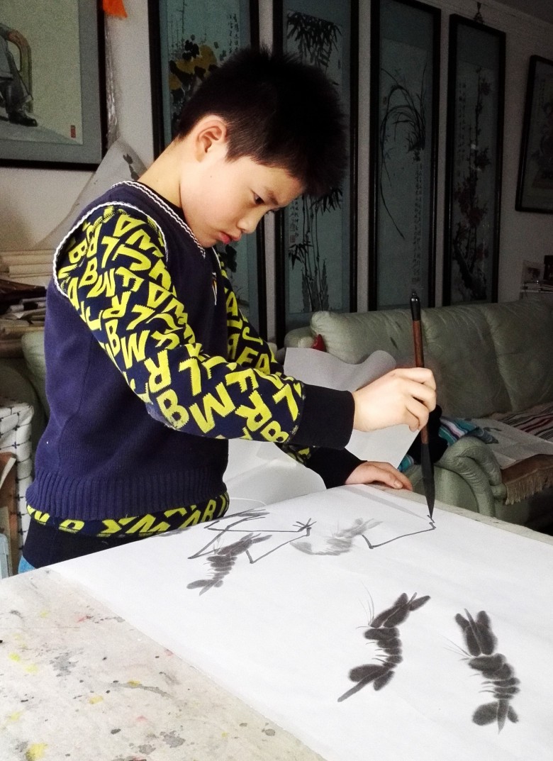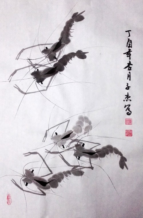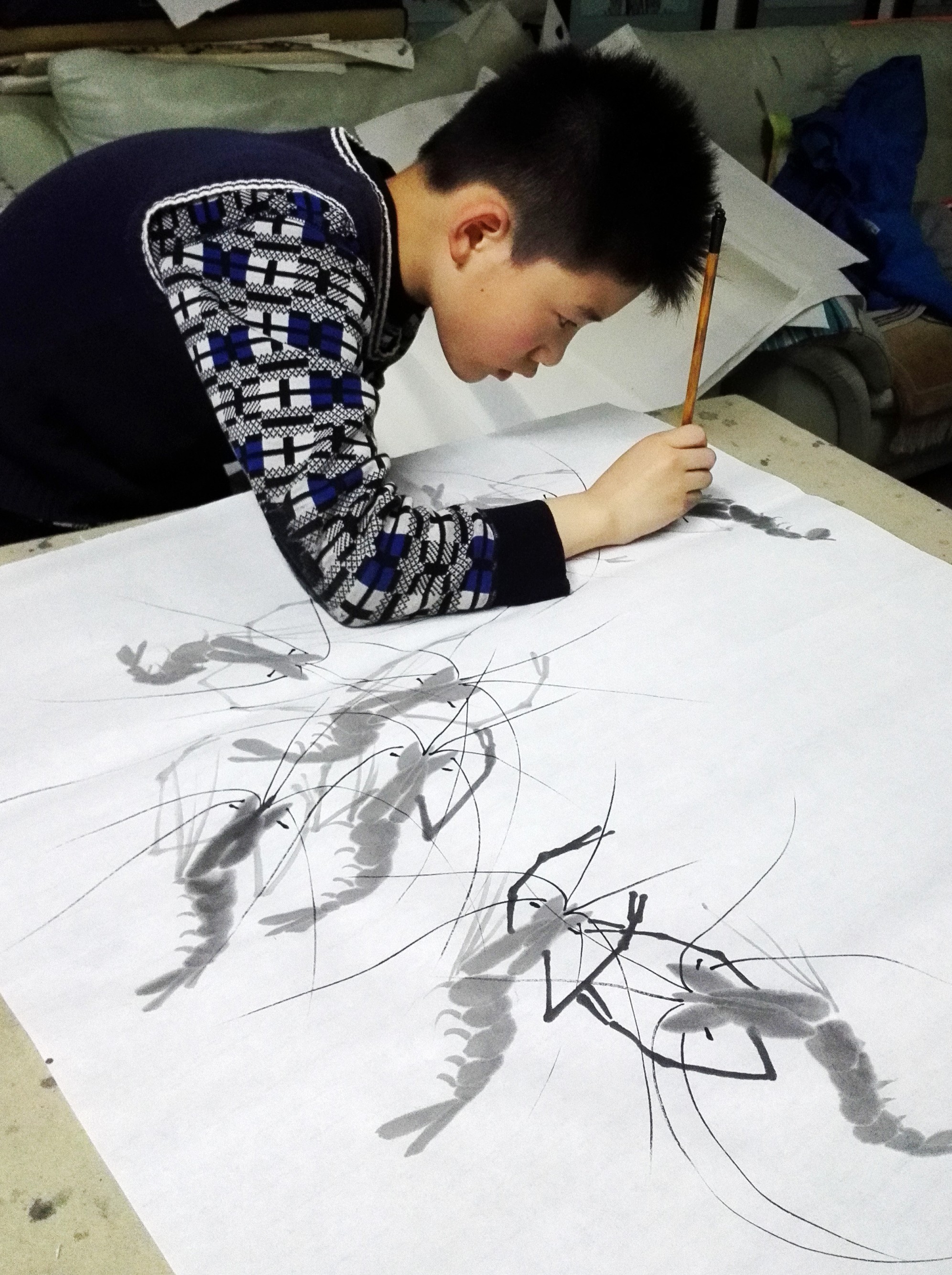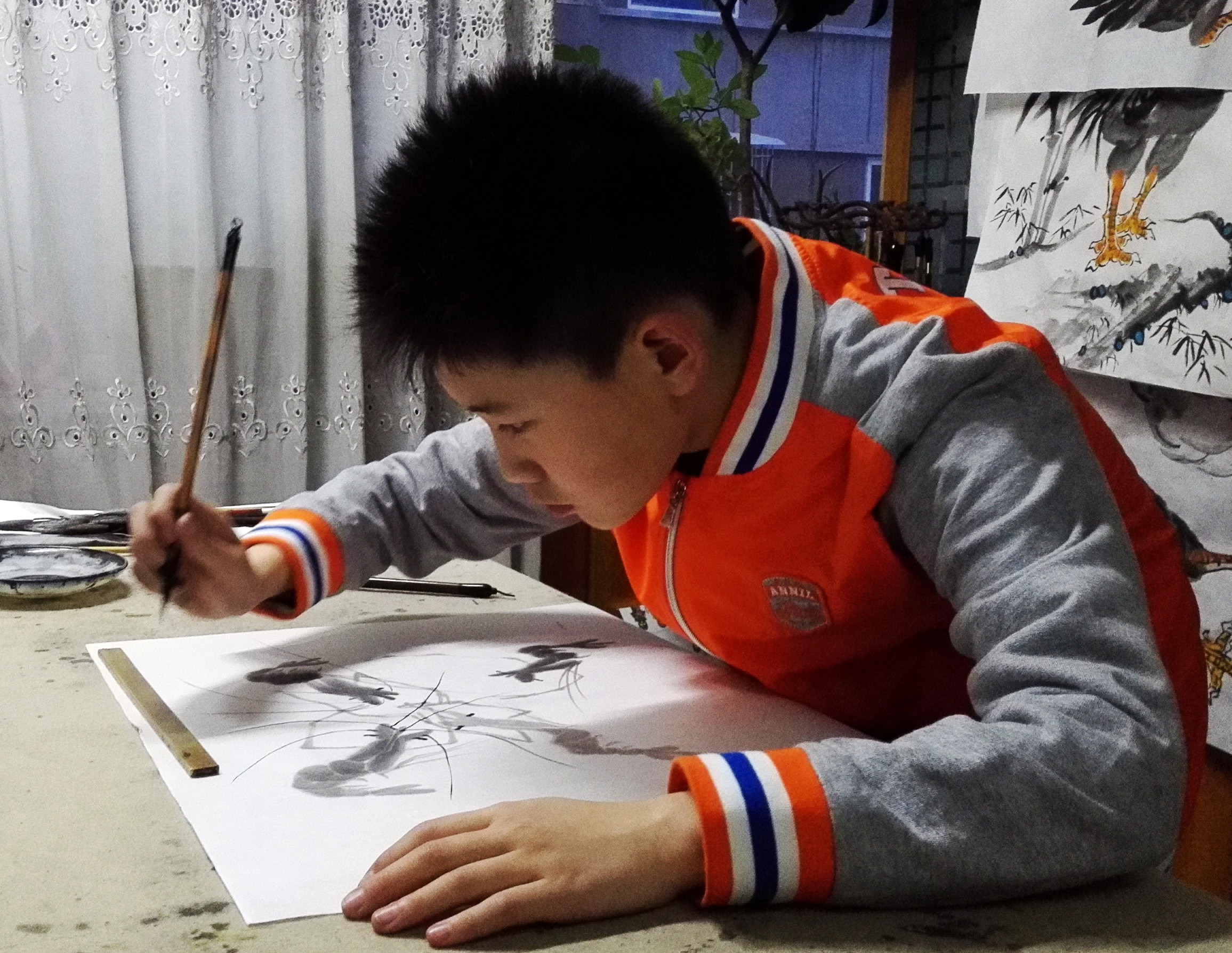 赵子杰是我的小孙子,祖籍陕西大荔,2006年4月出生于甘肃省兰州市。从去年寒假以来,在爷爷的指导下开始学习画虾,由于功课多,学习任务重,每周除了两个小时的素描课外,必须坚持一个小时的国画学习。近几个月来,画虾艺术明显提高,已熟练掌握了基本构图。