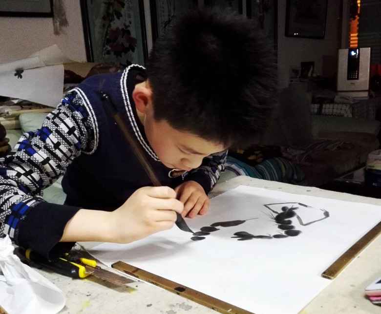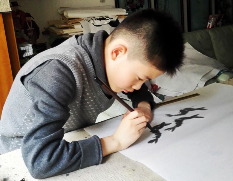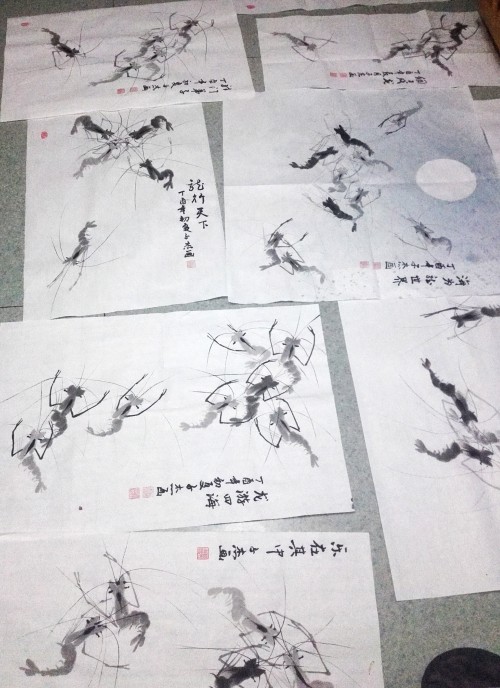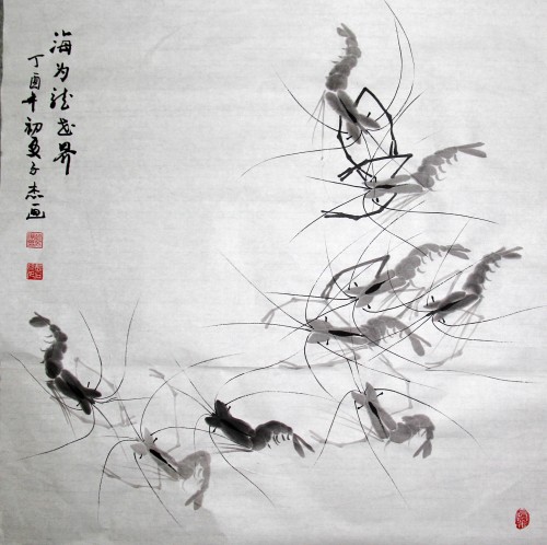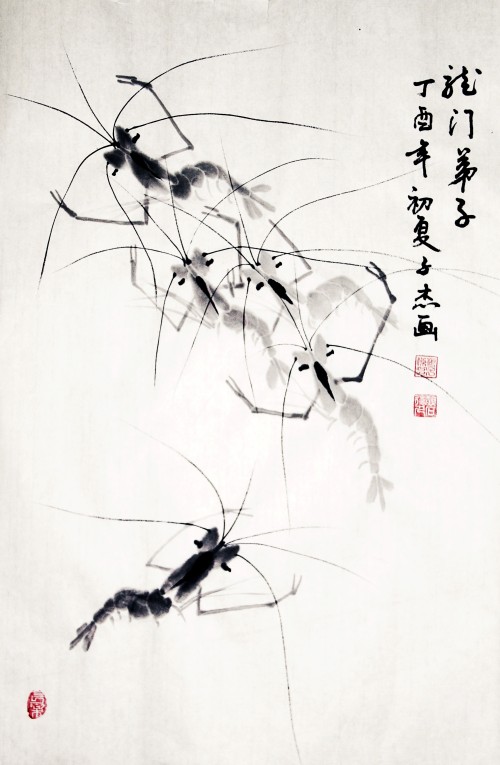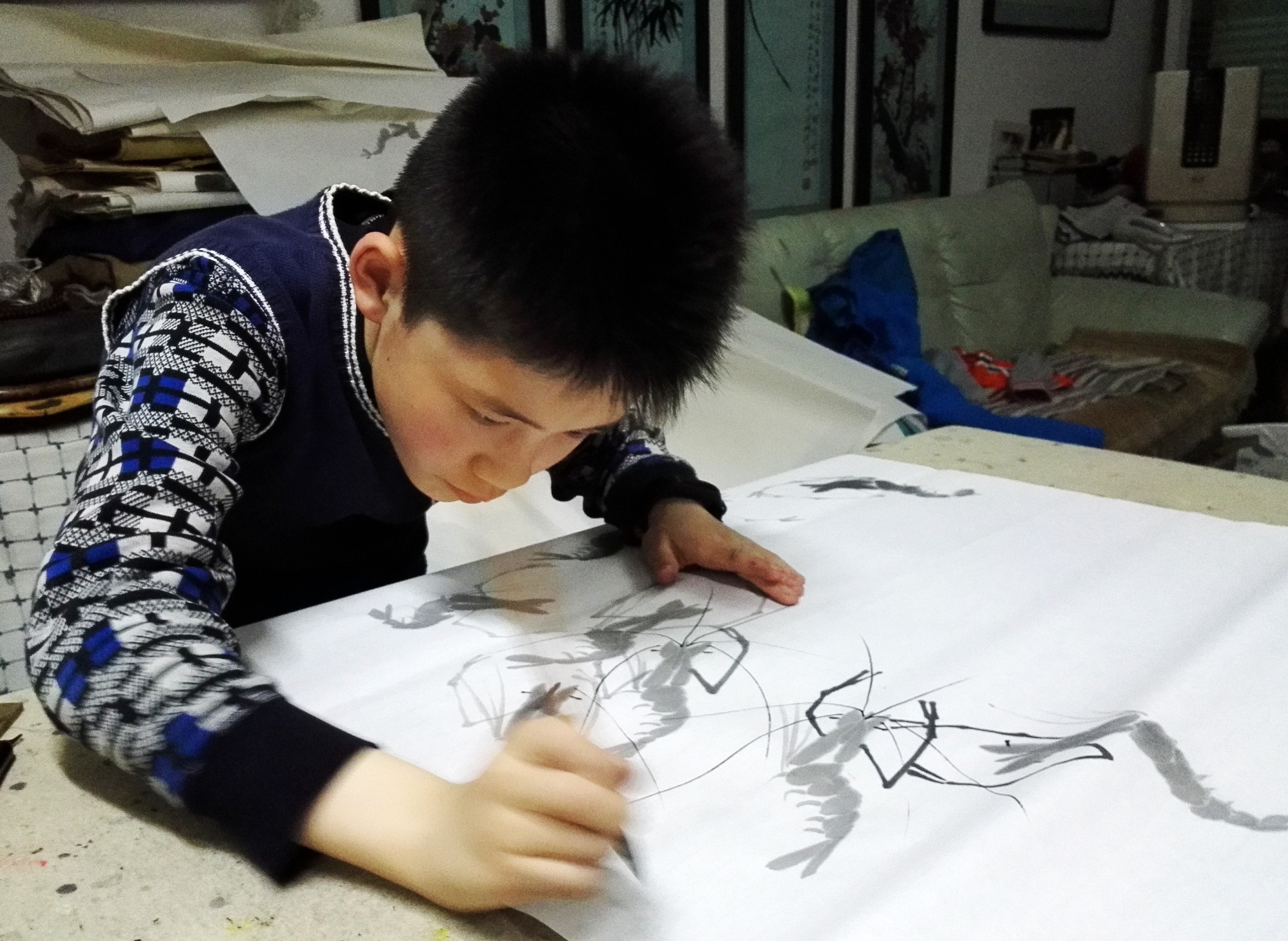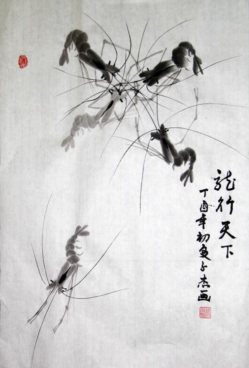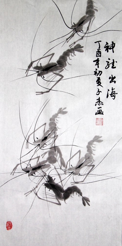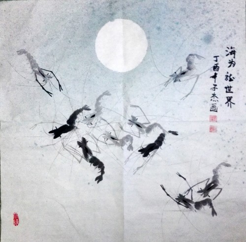 赵子杰是我的小孙子,祖籍陕西大荔,2006年4月出生于甘肃省兰州市。从去年寒假以来,在爷爷的指导下开始学习画虾,由于功课多,学习任务重,每周除了两个小时的素描课外,必须坚持一个小时的国画学习。近几个月来,画虾艺术明显提高,已熟练掌握了基本构图。
