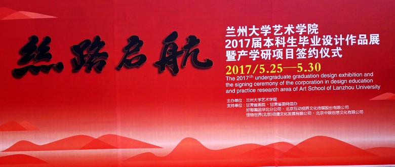 5月25日至30日,由兰州大学艺术学校主办,甘肃美术馆、甘肃省委网信办、好耶集团华北分公司.北京互动视界文化传媒股份有限公司、怪物世界“北京”动漫文化发展有限公司.北京中娱创想文化有限公司协办的“丝路启航”兰州大学艺术学院2017届本科生毕业设计作品展暨产学研项目签约仪式在甘肃画院举行。