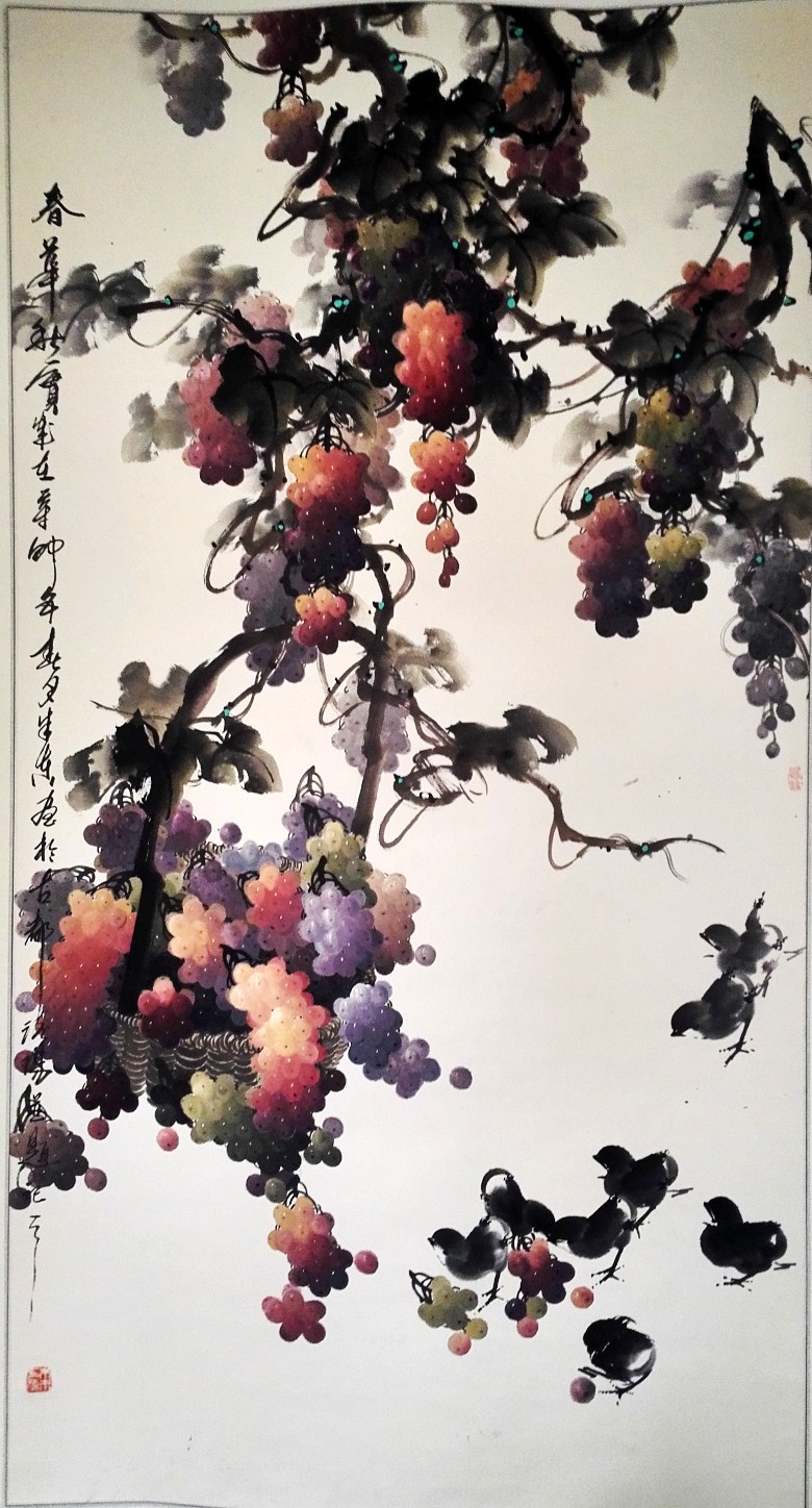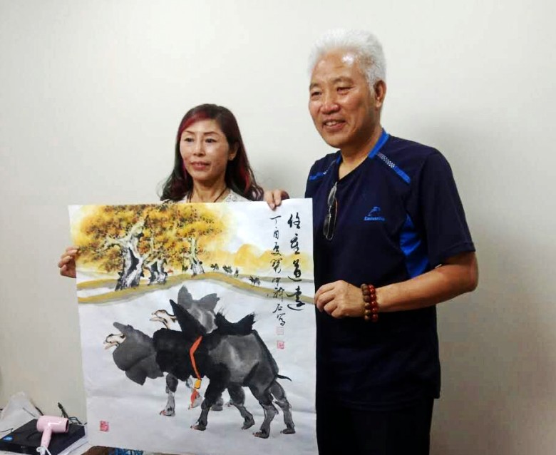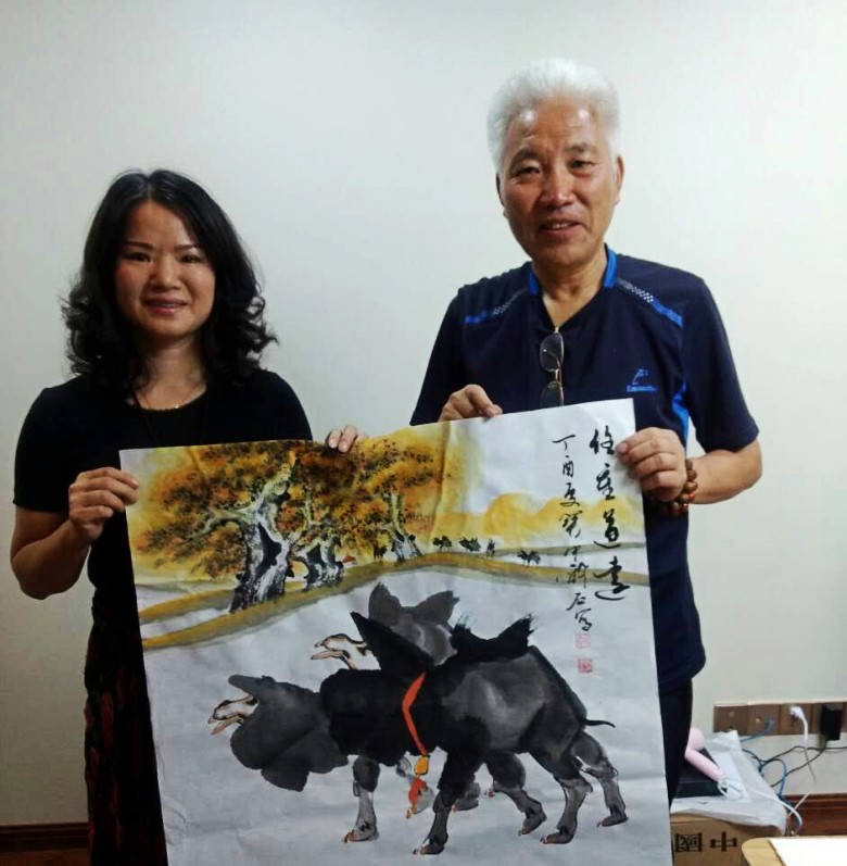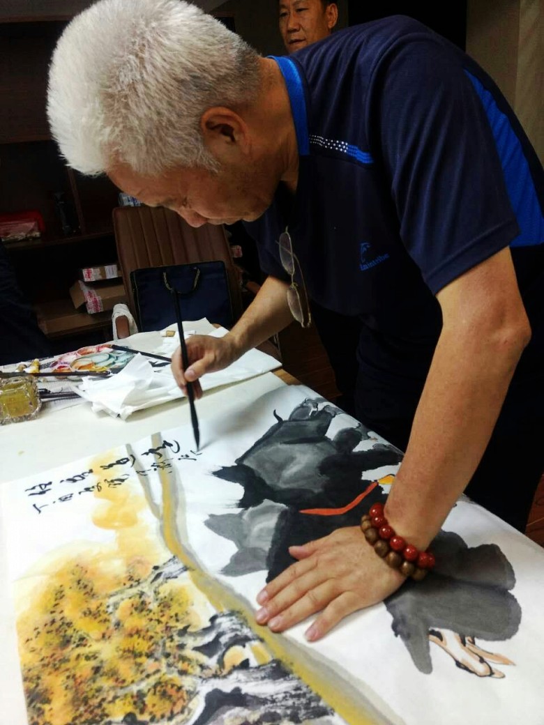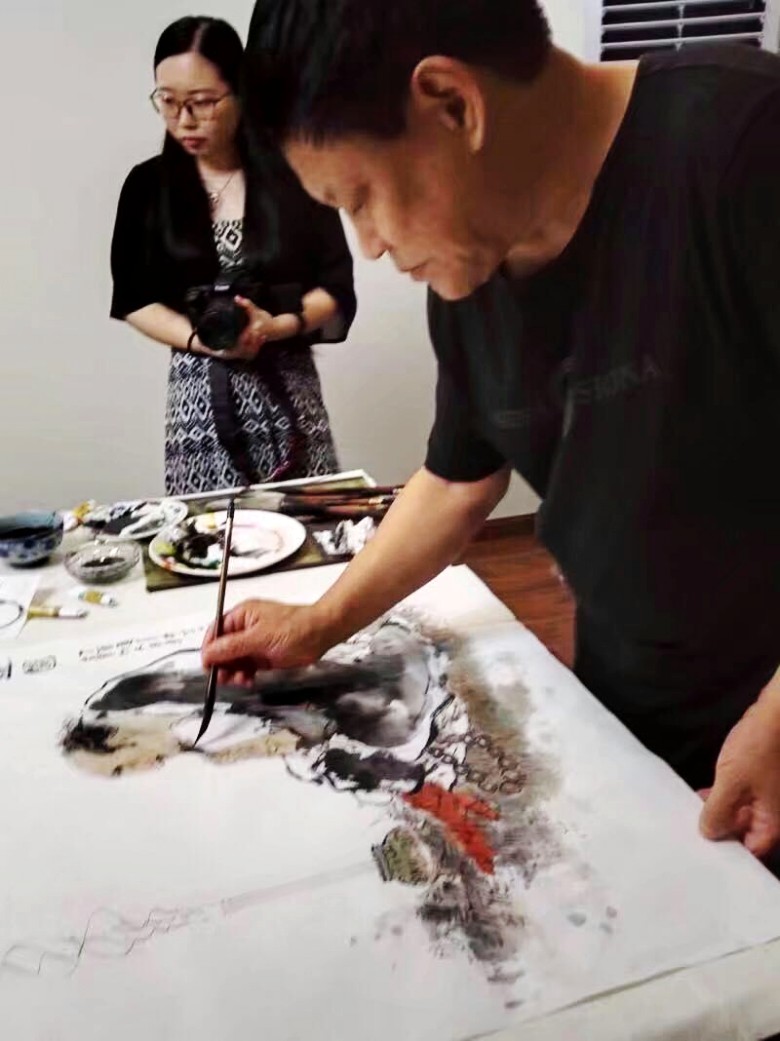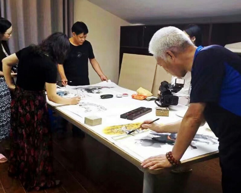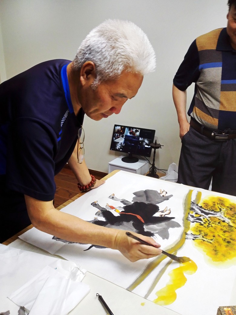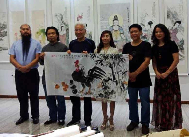 8号晚上,我们在书画家园宜兴艺术运营中心举行笔会,每人为刘俊英馆长创作国画作品一幅。在紫砂艺术家邹耀君先生的提议下,几位艺术家共同创作了一幅《吉祥如意》大作。赵振元首先画了大公鸡和柿子,赵胜东紧接着画了竹子石头,方芬添加了花草;张岩石再画三只小鸡,最后由书法家邓转旋先生题字。