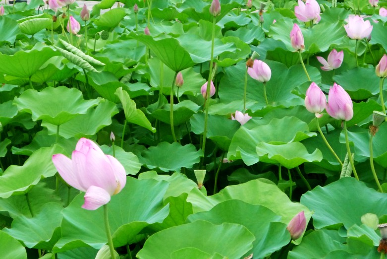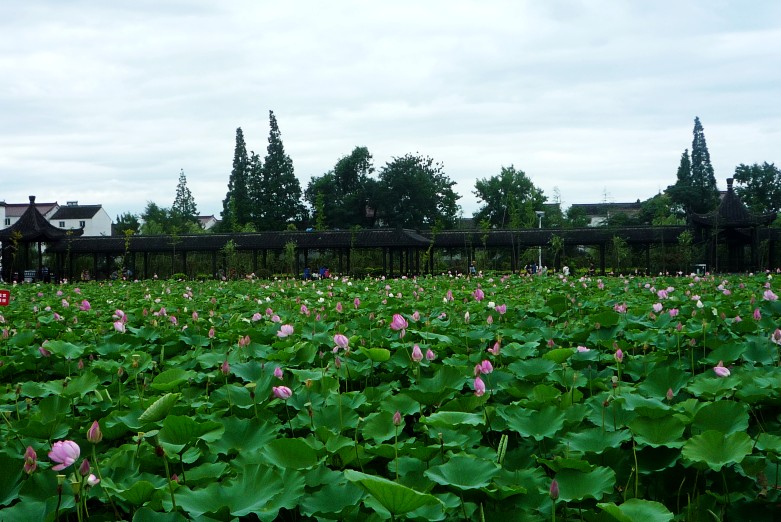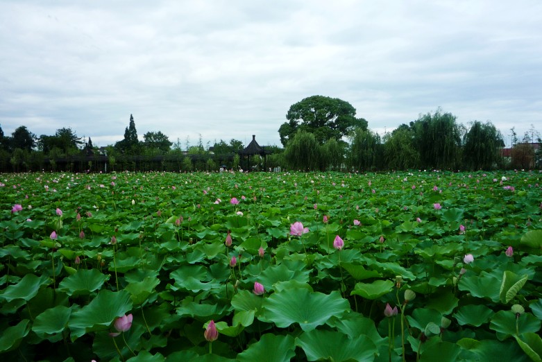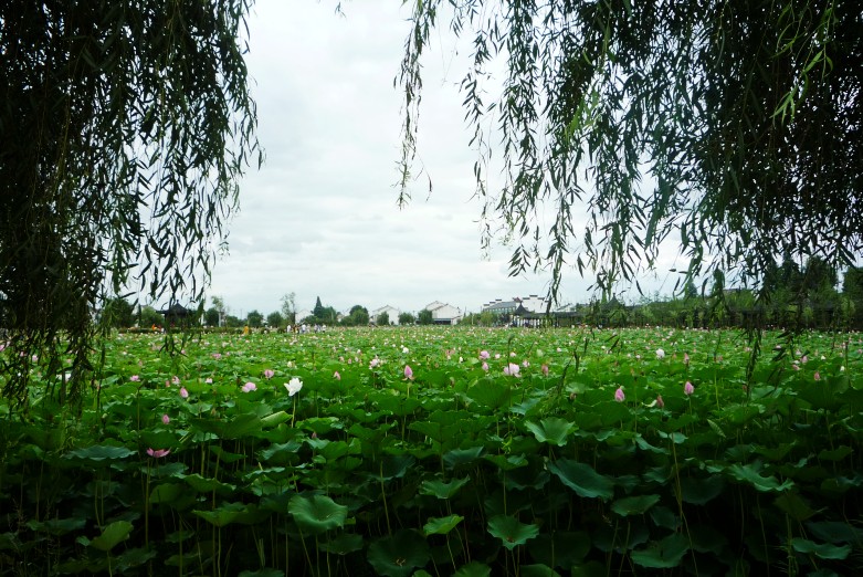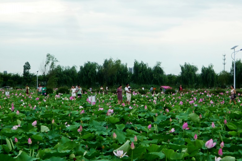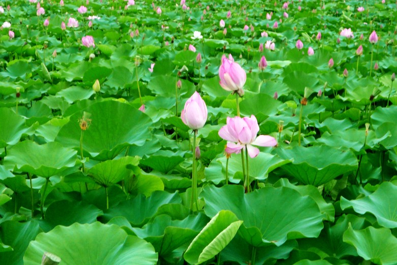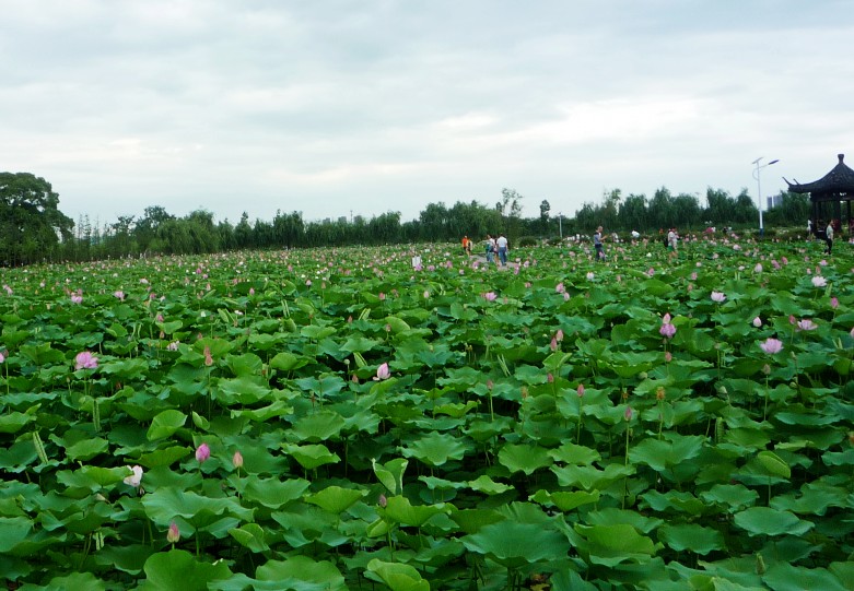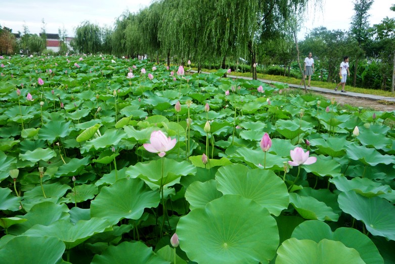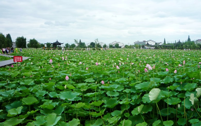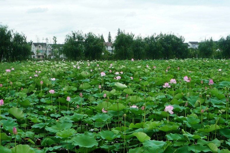 溧阳是国家级优秀旅游城市,车行到溧阳后,我们直接去“全国美丽宜居村庄示范”村――八字桥村。盛夏之际,八字桥湿地保护区300亩荷花嫣然盛开,前来赏荷的市民络绎不绝。我们眼前果然一片“接天莲叶无穷碧,映日荷花别样红。”的意境,绿叶红花,绵延无边,热烈而壮观!