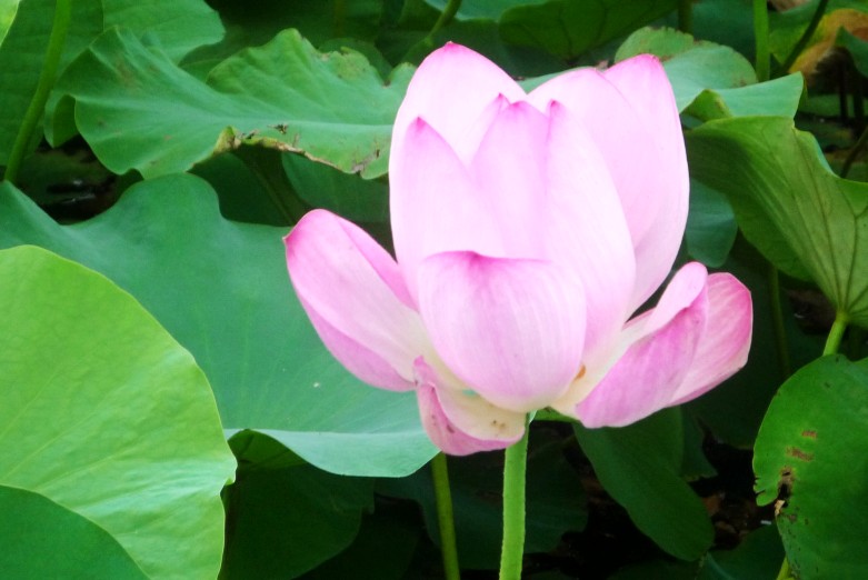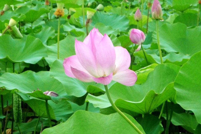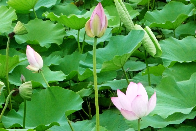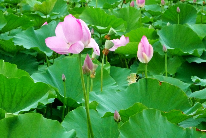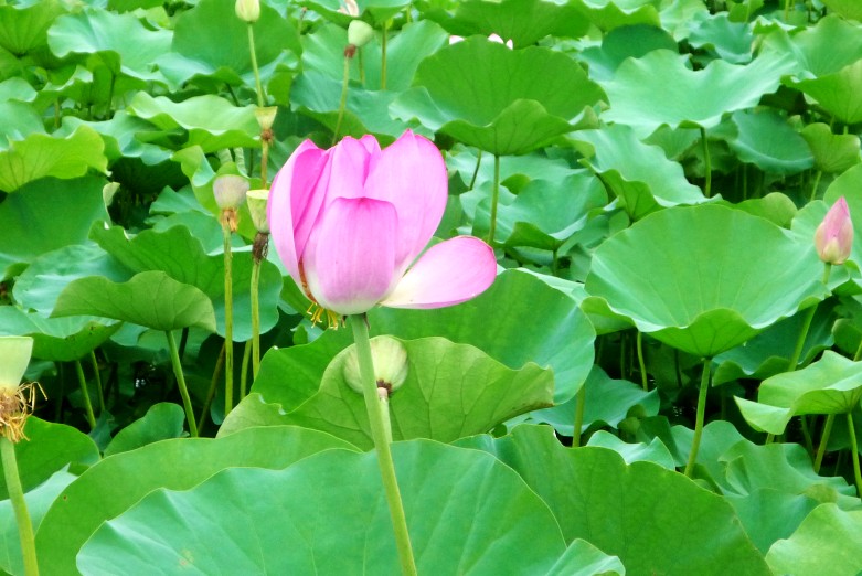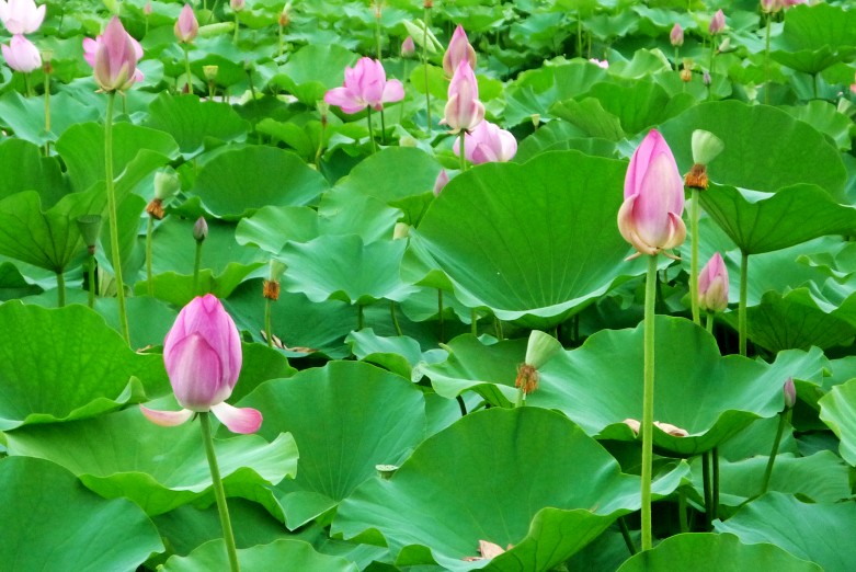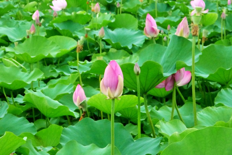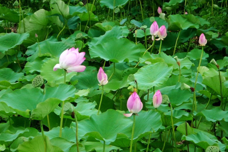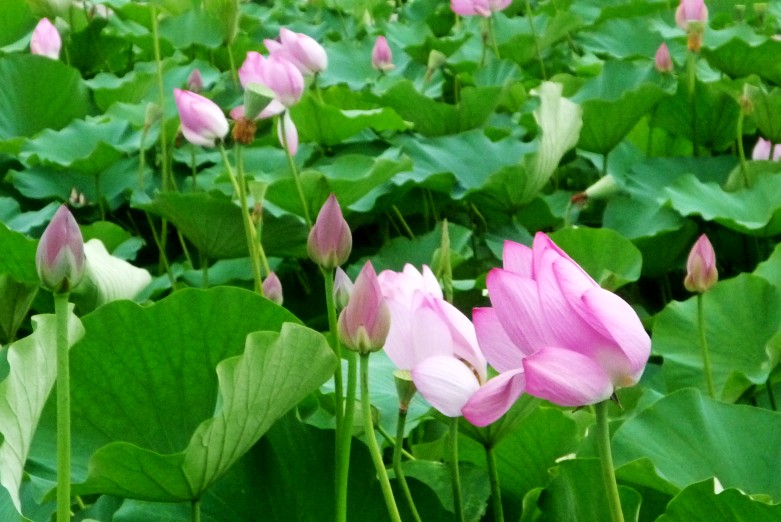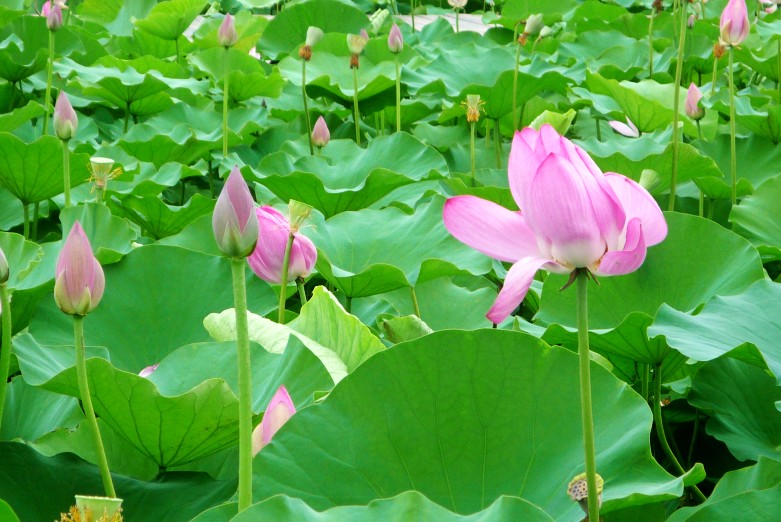 溧阳是国家级优秀旅游城市,车行到溧阳后,我们直接去“全国美丽宜居村庄示范”村――八字桥村。盛夏之际,八字桥湿地保护区300亩荷花嫣然盛开,前来赏荷的市民络绎不绝。我们眼前果然一片“接天莲叶无穷碧,映日荷花别样红。”的意境,绿叶红花,绵延无边,热烈而壮观!