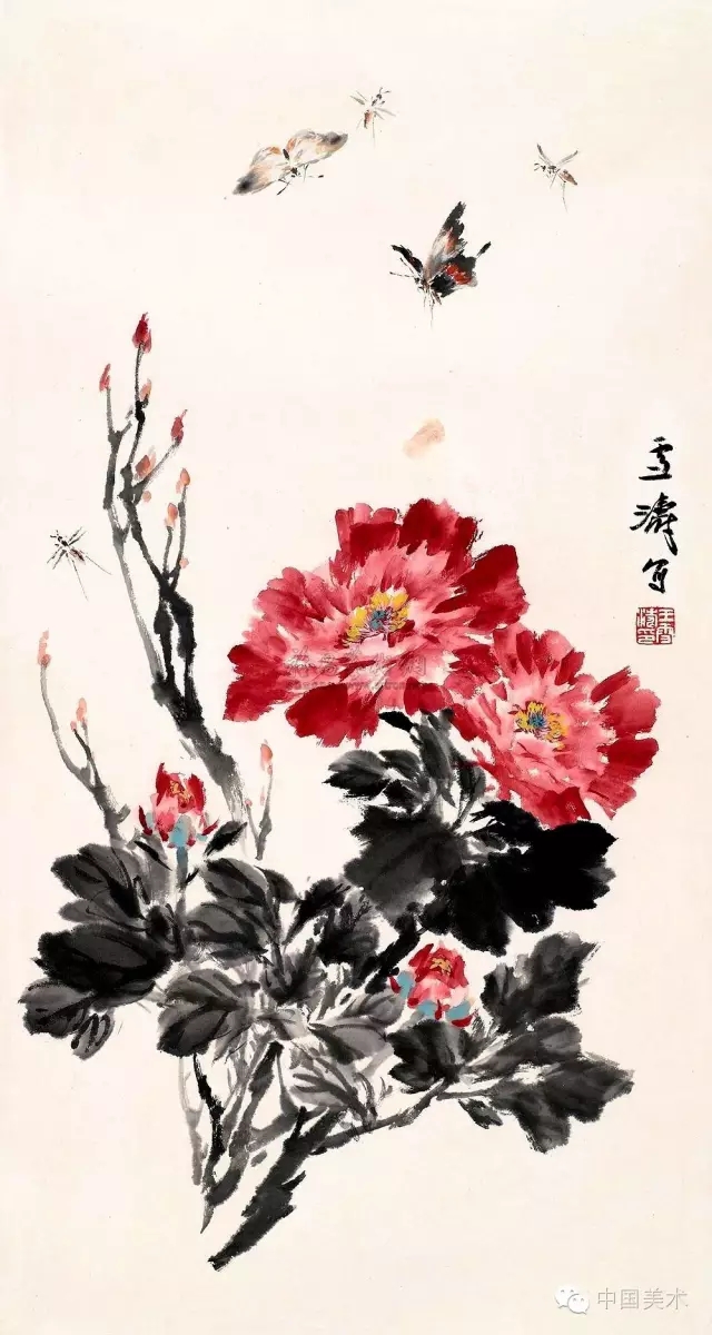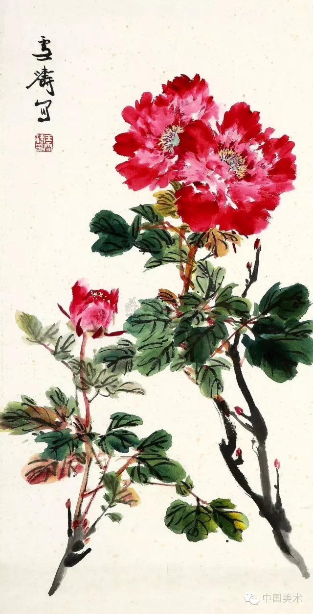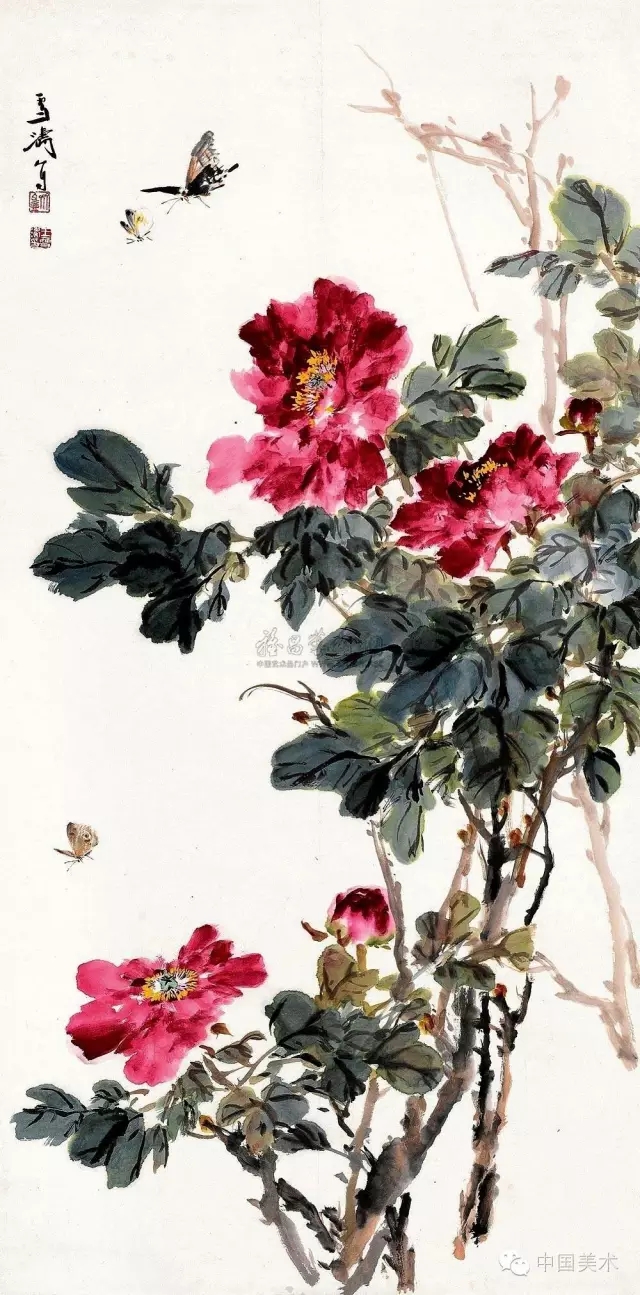 画牡丹最重要是要表达牡丹花的高贵而不俗和雍容大度的气质,但往往都易犯“三病”:一是用色不当,绚红搭绿,尖跳刺目,臃肿软疲,即为“甜俗”。二是一味粉厚色浓,干涩涂抹,滞腻浮涨,色墨混浊,此谓“脂粉气”。三是凝结板刻、僵硬平匀、造型陈腐、缺乏生气,俗称“工艺气”。