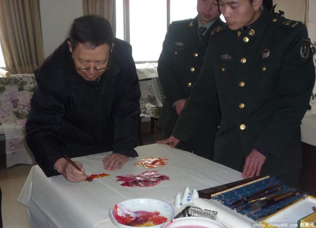 元月13日上午,在兰州军区老战士大学校长刘玉斋将军和主任李天荣将军的带领下,兰州军区兰州老战士大学书画研究会一行20余人冒着严寒,来到兰州市七里河区二十里铺驻军某部,开展迎新春送书画到军营活动。参加这次活动的有朱世章、柴发旺、赵振元、赵军等10余位书画家,他们每人不仅带去了自己的精品进行展览,还为部队官兵带去了一部分书画精品。同时现场挥毫泼墨,按照官兵们的要求,创作出百余幅书画佳作,受到了广大官兵的好评。