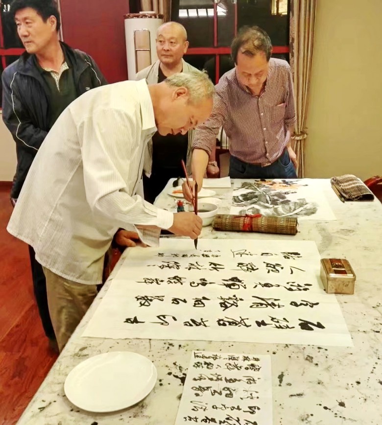 晚上,我们在天鹅湖新村品尝这里的特色美味豆花面和“二脑壳”酒。据说,“二脑壳”是当地人用玉米做成的酒,梅园沟家家户户都会酿造这种土酒,贵客上门,主人以酒款待,形同敬茶。一杯酒饮下肚去,肠胃温热,满口醇香,喝多了,眼睛就会出现重影,看什么东西都是两个,看人也是两个脑袋,因此叫“二脑壳”。晚饭后,我们来到阳坝镇举行文化笔会,书画家们借着酒兴,挥毫泼墨,每人为乡镇村民们创作了10余幅书画作品。笔会延长到晚上23点半以后才结束。