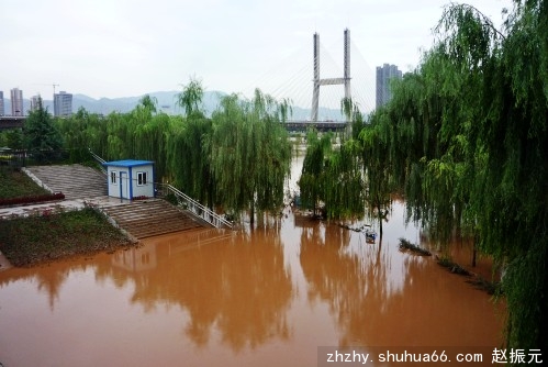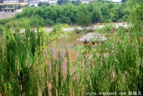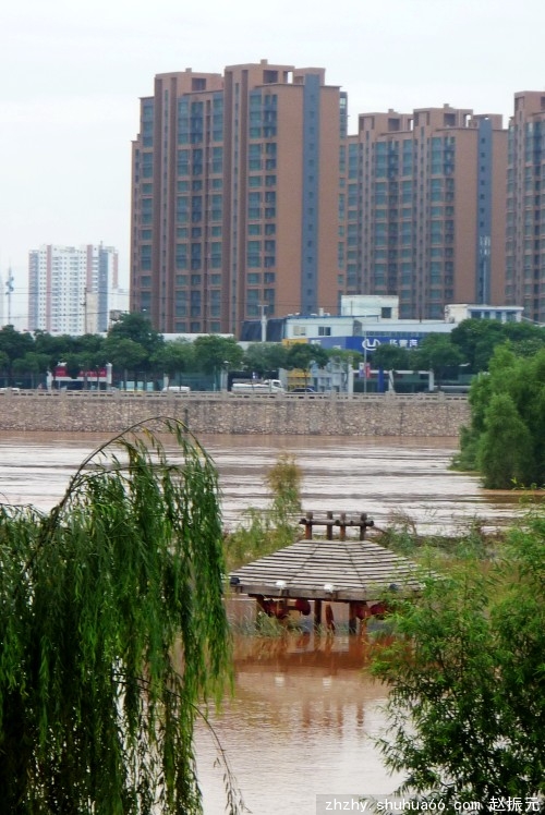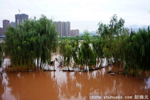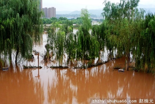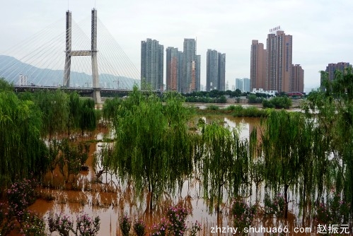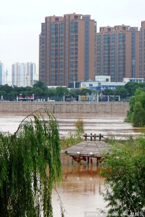 图为兰州黄河湿地公园被淹情景。