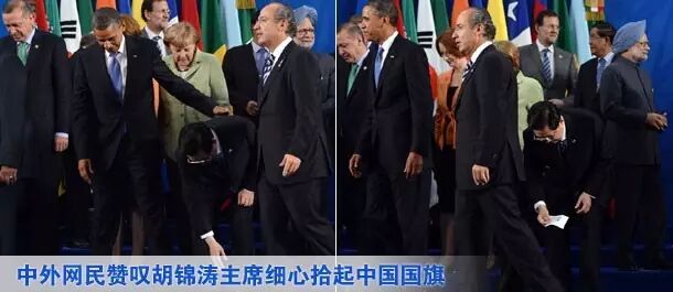 这不由得使我想起2012年6月18日,G20峰会在墨西哥洛斯卡沃斯开幕。在领导人合影中,主办方用国旗贴纸来标示各国领导人的位置。合影完毕,领导人散去,脚下国旗被踩来踩去。而中国国家主席胡锦涛弯腰把这面中国国旗贴纸捡起,细心地收了起来。胡锦涛主席的行为从而受到国内外民众的广泛赞誉。