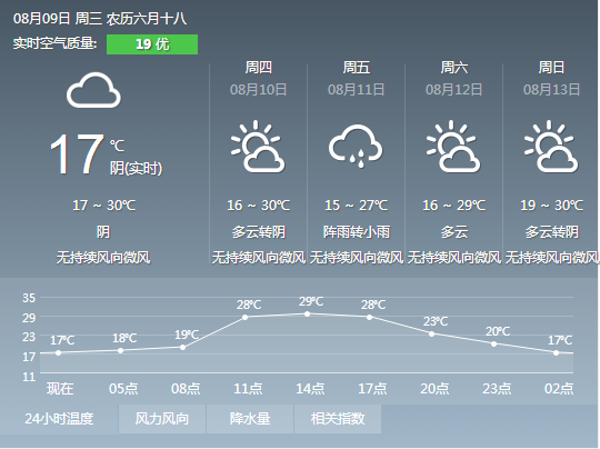 目前九寨沟气温20摄氏度,夜间最低温度17摄氏度,阴。明天阵雨转多云,最高气温29摄氏度。