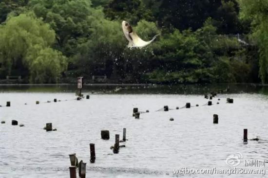 西湖“鱼跃龙门”奇景:大白鲢一蹦三尺高