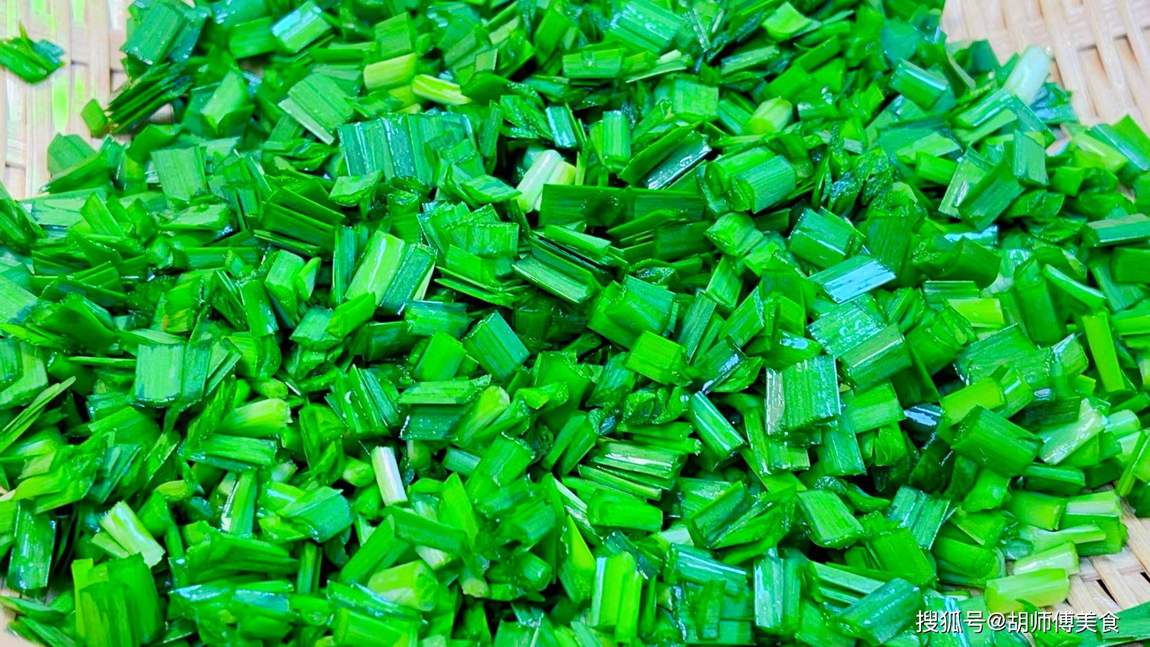 第一步:把韭菜洗净后沥干水分,然后将韭菜切成0.3厘米的小段,接着将一勺油放入韭菜中搅拌均匀备用。