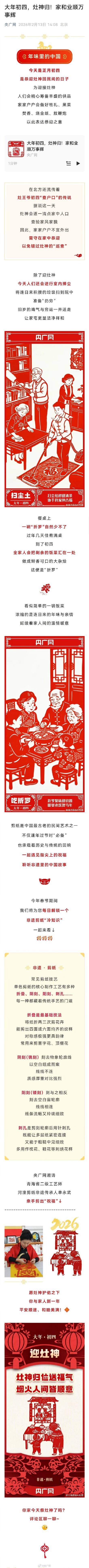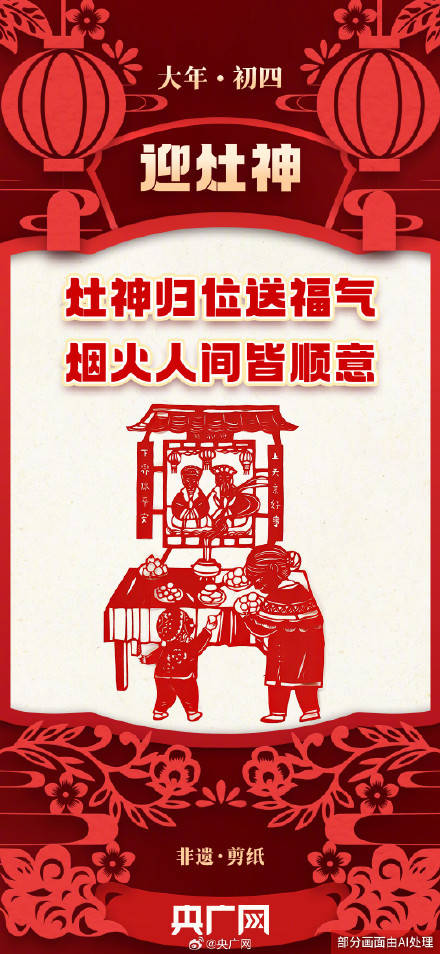 今天是正月初四,是恭迎灶神回民间的日子。为迎接灶神,人们会精心筹备丰盛的供品,家家户户会备好牲礼、果菜、焚香、烧金纸、放鞭炮,以此表达恭迎之意。除了迎灶神,今天人们还会进行室内掸尘,将连日来积攒的垃圾扫到院中,准备“扔穷”,旧岁的晦气与穷运一并送走,让家宅更显洁净祥和。